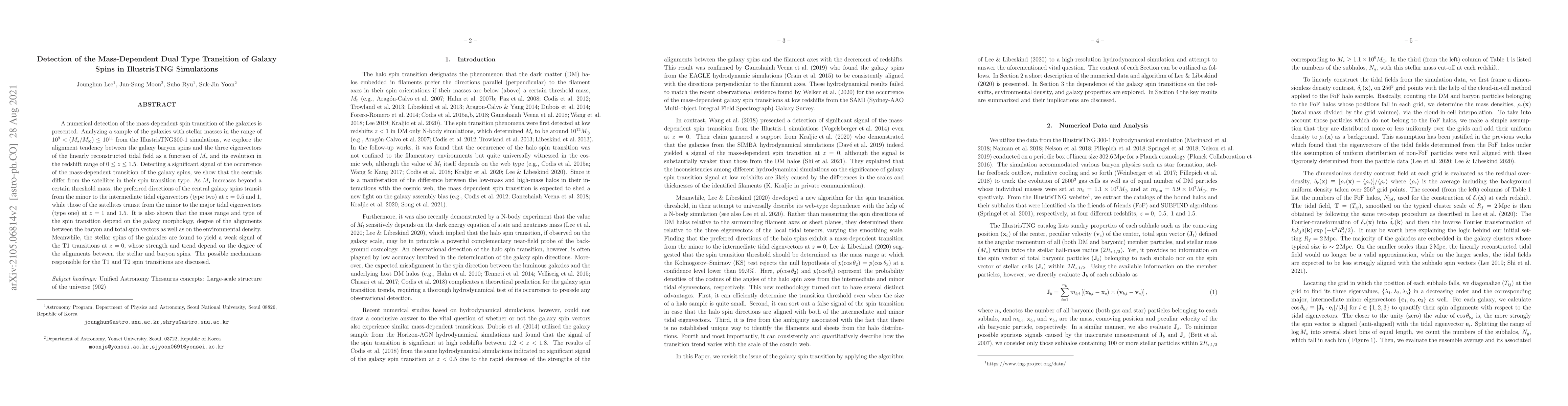 A numerical detection of the mass-dependent spin transition of the galaxies is presented. Analyzing a sample of the galaxies with stellar masses in the range of $10^{9}< (M_{\star}/M_{\odot})\le 10^{11}$ from the IllustrisTNG300-1 simulations, we explore the alignment tendency between the galaxy baryon spins and the three eigenvectors of the linearly reconstructed tidal field as a function of $M_{\star}$ and its evolution in the redshift range of $0\le z \le 1.5$. Detecting a significant signal of the occurrence of the mass-dependent transition of the galaxy spins, we show that the centrals differ from the satellites in their spin transition type. As $M_{\star}$ increases beyond a certain threshold mass, the preferred directions of the central galaxy spins transit from the minor to the intermediate tidal eigenvectors (type two) at $z=0.5$ and $1$, while those of the satellites transit from the minor to the major tidal eigenvectors (type one) at $z=1$ and $1.5$. It is also shown that the mass range and type of the spin transition depend on the galaxy morphology, degree of the alignments between the baryon and total spin vectors as well as on the environmental density. Meanwhile, the stellar spins of the galaxies are found to yield a weak signal of the T1 transitions at $z=0$, whose strength and trend depend on the degree of the alignments between the stellar and baryon spins. The possible mechanisms responsible for the T1 and T2 spin transitions are discussed.