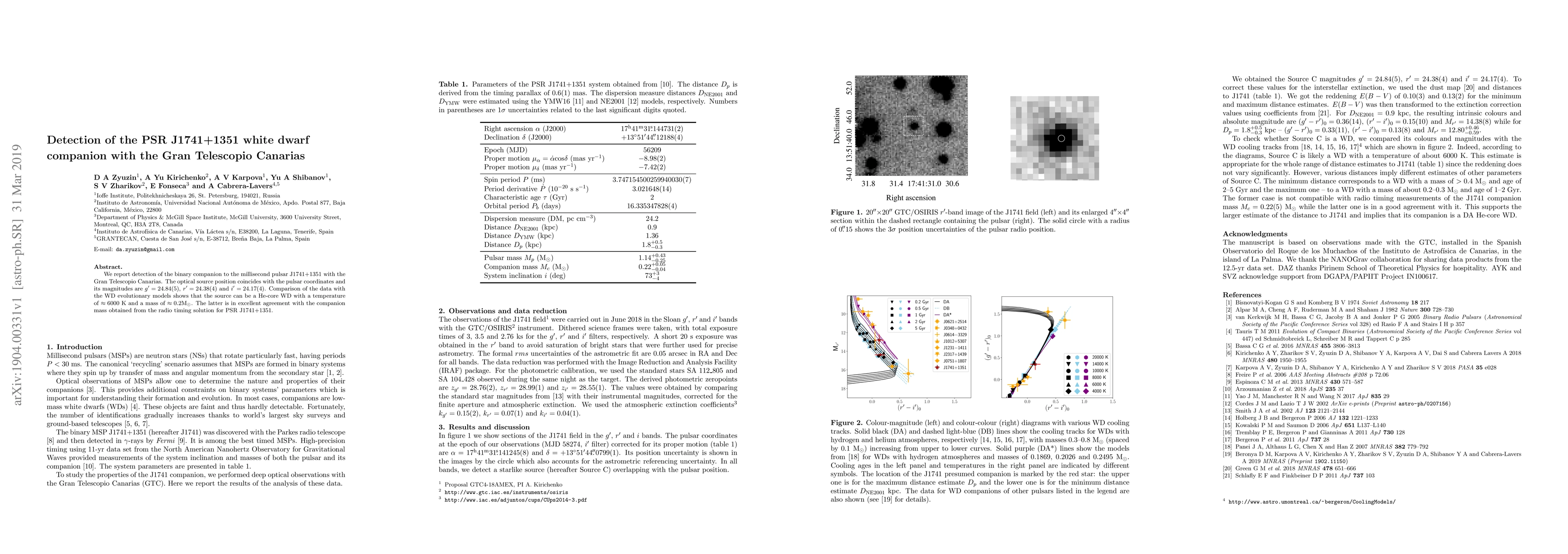 The Gran Telescopio Canarias detected a white dwarf companion to the millisecond pulsar PSR J1741+1351, with optical magnitudes g' = 24.84, r' = 24.38, and i' = 24.17. The companion is identified as a He-core white dwarf with a temperature of ~6000 K and a mass of ~0.2 M$_{\odot}$, matching the mass derived from radio timing data.