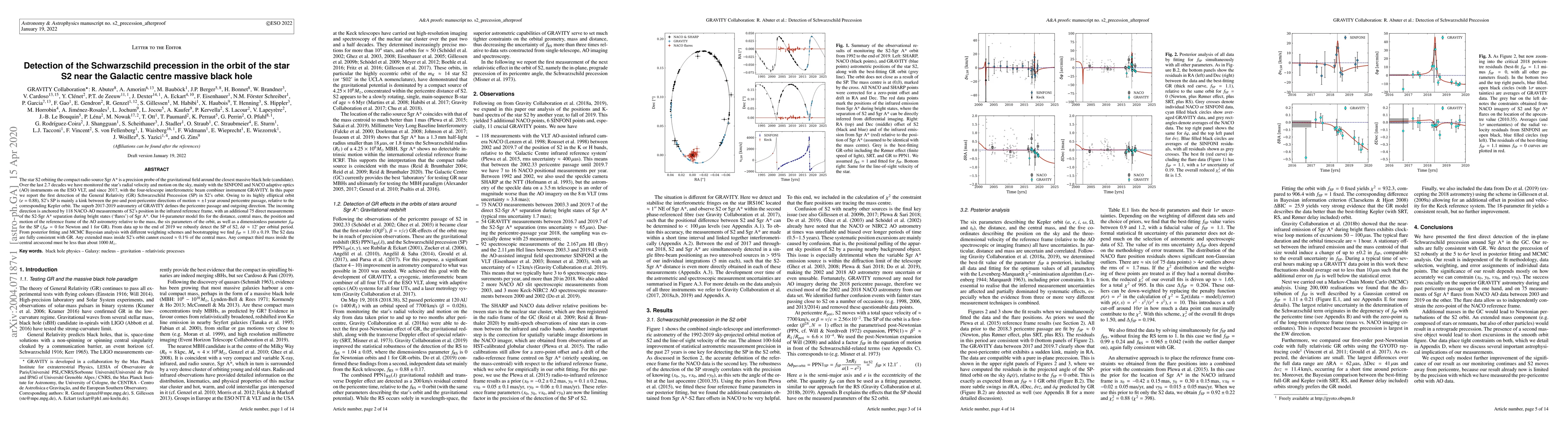 This paper reports the first detection of the Schwarzschild precession in the orbit of star S2 around the supermassive black hole Sgr A* at the Galactic centre, confirming predictions of General Relativity. The study uses data from adaptive optics and interferometry to precisely track S2's orbit, revealing a precession of 12' per orbital period, consistent with GR's predictions.
