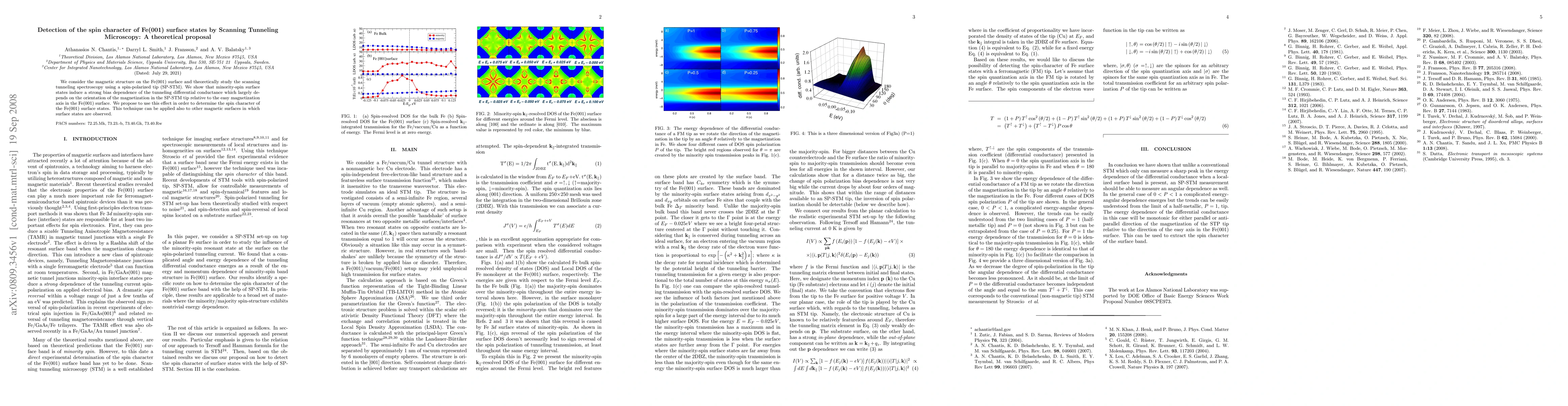 The study proposes using spin-polarized scanning tunneling microscopy (SP-STM) to detect the spin character of Fe(001) surface states, revealing that minority-spin states induce a bias-dependent tunneling conductance that varies with the tip magnetization orientation. This method aims to determine the spin character of Fe(001) surface states and can be extended to other magnetic surfaces.