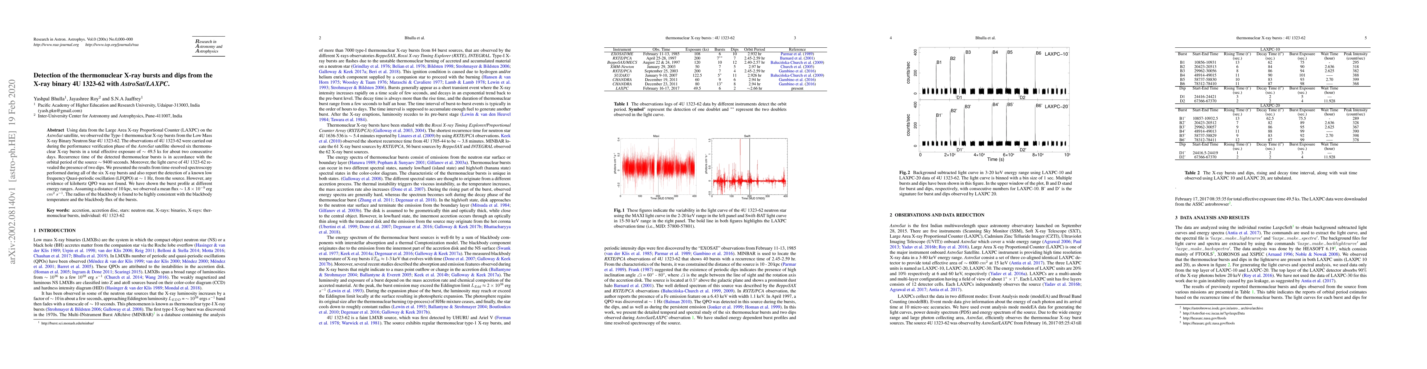 Using data from the Large Area X-ray Proportional Counter (LAXPC) on the \textit{AstroSat} satellite, we observed the Type-1 thermonuclear X-ray bursts from the Low Mass X-ray Binary Neutron Star 4U 1323-62. The observations of 4U 1323-62 were carried out during the performance verification phase of the \textit{AstroSat} satellite showed six thermonuclear X-ray bursts in a total effective exposure of $\sim$ 49.5 ks for about two consecutive days. Recurrence time of the detected thermonuclear bursts is in accordance with the orbital period of the source $\sim$ 9400 seconds. Moreover, the light curve of 4U 1323-62 revealed the presence of two dips. We presented the results from time-resolved spectroscopy performed during all of the six X-ray bursts and also report the detection of a known low frequency Quasi-periodic oscillation (LFQPO) at $\sim$ 1 Hz, from the source. However, any evidence of kilohertz QPO was not found. We have shown the burst profile at different energy ranges. Assuming a distance of 10 kpc, we observed a mean flux $\sim$ 1.8 $\times$ $10^{-9}$ erg $cm^2$ $s^{-1}$. The radius of the blackbody is found to be highly consistent with the blackbody temperature and the blackbody flux of the bursts.