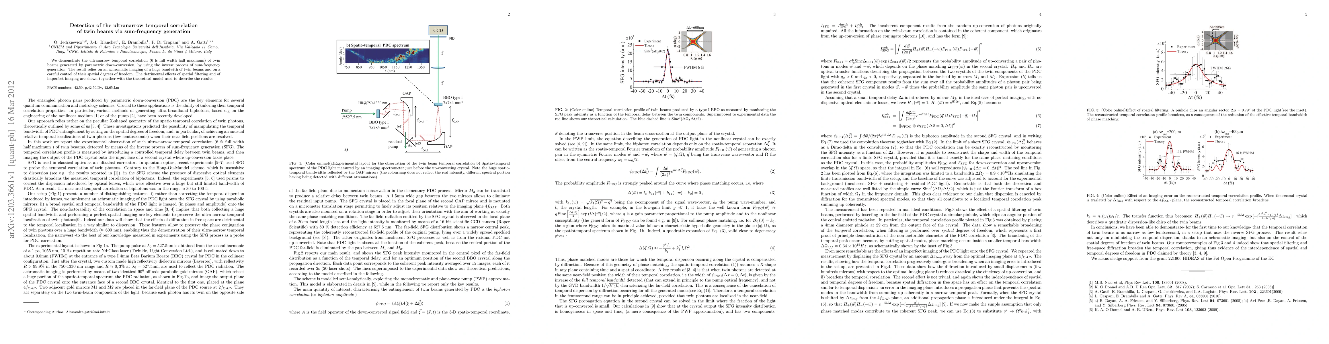 This paper demonstrates the detection of ultranarrow temporal correlation (6 fs) of twin beams via the inverse process of sum-frequency generation, highlighting the importance of achromatic imaging and spatial degree control to mitigate filtering and imaging imperfections. The study provides a theoretical model to describe the observed results.