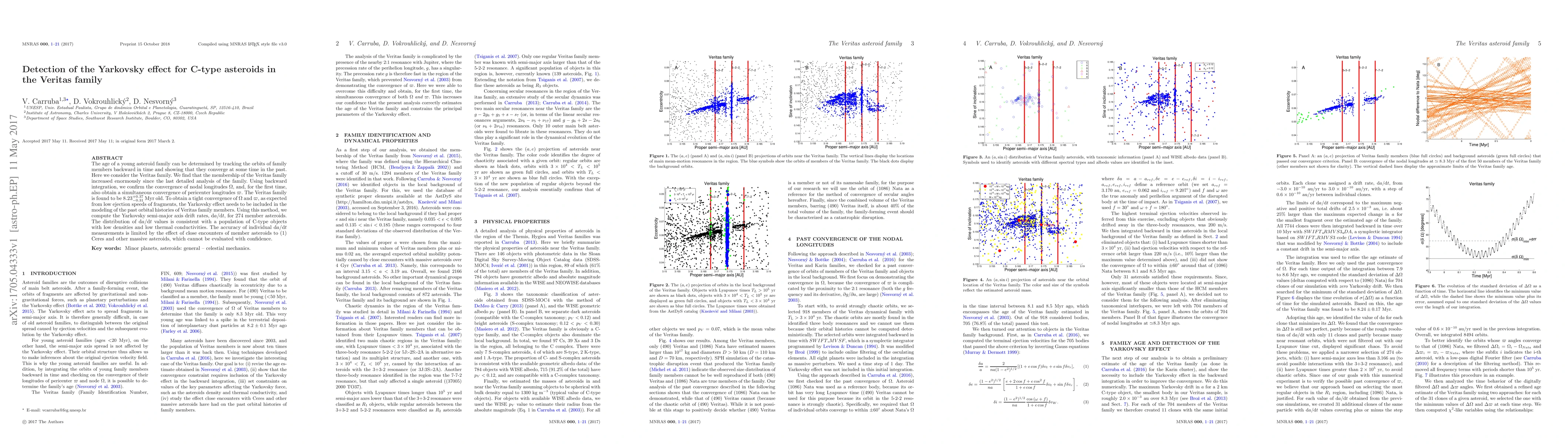 The age of a young asteroid family can be determined by tracking the orbits of family members backward in time and showing that they converge at some time in the past. Here we consider the Veritas family. We find that the membership of the Veritas family increased enormously since the last detailed analysis of the family. Using backward integration, we confirm the convergence of nodal longitudes $\Omega$, and, for the first time, also obtain a simultaneous convergence of pericenter longitudes $\varpi$. The Veritas family is found to be $8.23^{+0.37}_{-0.31}$~Myr old. To obtain a tight convergence of $\Omega$ and $\varpi$, as expected from low ejection speeds of fragments, the Yarkovsky effect needs to be included in the modeling of the past orbital histories of Veritas family members. Using this method, we compute the Yarkovsky semi-major axis drift rates, ${\rm d}a/{\rm d}t$, for 274 member asteroids. The distribution of ${\rm d}a/{\rm d}t$ values is consistent with a population of C-type objects with low densities and low thermal conductivities. The accuracy of individual ${\rm d}a/{\rm d}t$ measurements is limited by the effect of close encounters of member asteroids to (1) Ceres and other massive asteroids, which cannot be evaluated with confidence.