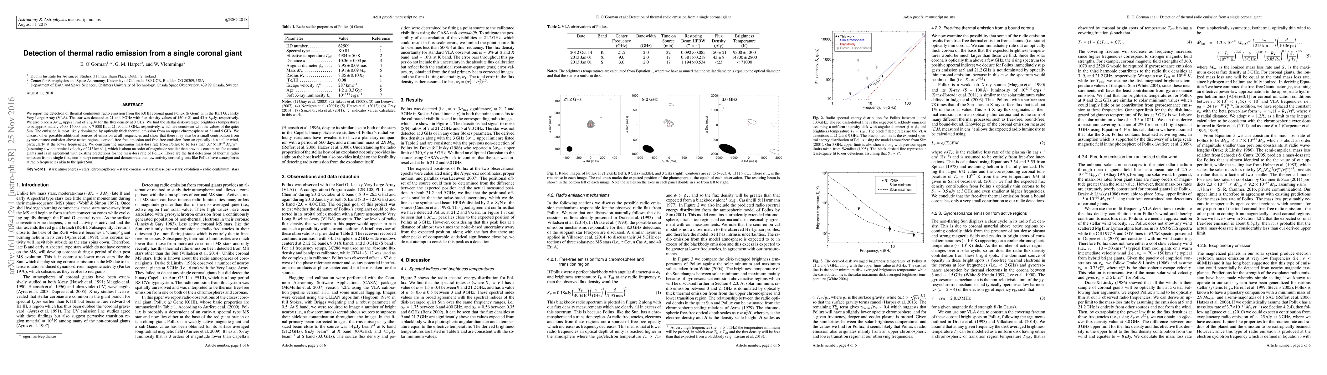 We report the detection of thermal continuum radio emission from the K0 III coronal giant Pollux ($\beta$ Gem) with the Karl G. Jansky Very Large Array (VLA). The star was detected at 21 and 9 GHz with flux density values of $150\pm21$ and $43\pm8\,\mu$Jy, respectively. We also place a $3\sigma_{\mathrm{rms}}$ upper limit of $23\,\mu$Jy for the flux density at 3 GHz. We find the stellar disk-averaged brightness temperatures to be approximately 9500, 15000, and $<71000\,$K, at 21, 9, and 3 GHz, respectively, which are consistent with the values of the quiet Sun. The emission is most likely dominated by optically thick thermal emission from an upper chromosphere at 21 and 9 GHz. We discuss other possible additional sources of emission at all frequencies and show that there may also be a small contribution from gyroresonance emission above active regions, coronal free-free emission and free-free emission from an optically thin stellar wind, particularly at the lower frequencies. We constrain the maximum mass-loss rate from Pollux to be less than $3.7\times 10^{-11}\,M_{\odot}$ yr$^{-1}$ (assuming a wind terminal velocity of 215 km s$^{-1}$), which is about an order of magnitude smaller than previous constraints for coronal giants and is in agreement with existing predictions for the mass-loss rate of Pollux. These are the first detections of thermal radio emission from a single (i.e., non-binary) coronal giant and demonstrate that low activity coronal giants like Pollux have atmospheres at radio frequencies akin to the quiet Sun.
