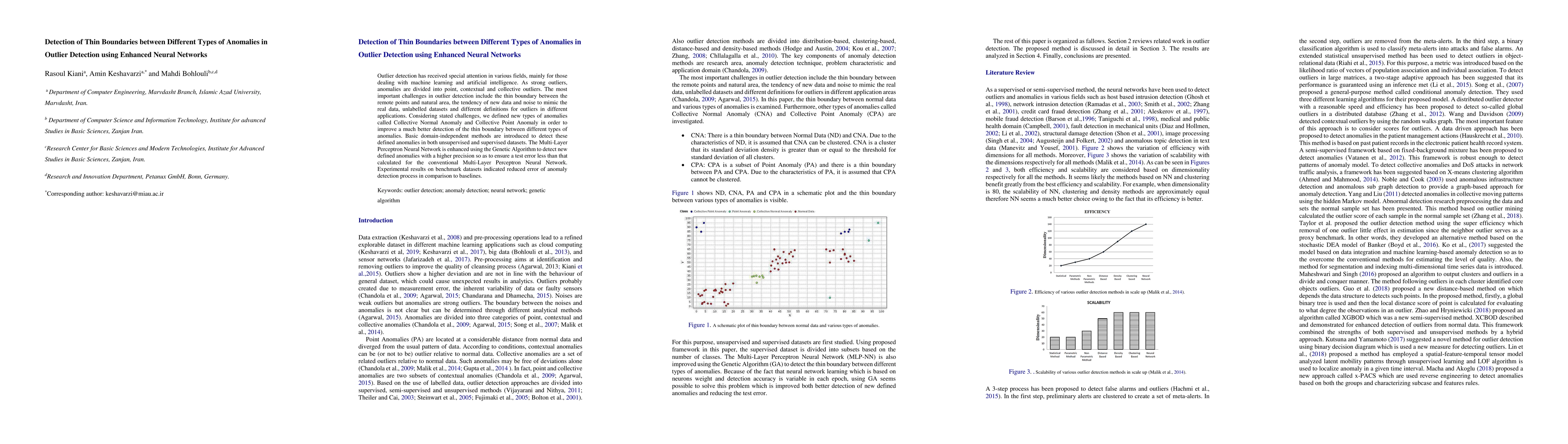 Outlier detection has received special attention in various fields, mainly for those dealing with machine learning and artificial intelligence. As strong outliers, anomalies are divided into the point, contextual and collective outliers. The most important challenges in outlier detection include the thin boundary between the remote points and natural area, the tendency of new data and noise to mimic the real data, unlabelled datasets and different definitions for outliers in different applications. Considering the stated challenges, we defined new types of anomalies called Collective Normal Anomaly and Collective Point Anomaly in order to improve a much better detection of the thin boundary between different types of anomalies. Basic domain-independent methods are introduced to detect these defined anomalies in both unsupervised and supervised datasets. The Multi-Layer Perceptron Neural Network is enhanced using the Genetic Algorithm to detect newly defined anomalies with higher precision so as to ensure a test error less than that calculated for the conventional Multi-Layer Perceptron Neural Network. Experimental results on benchmark datasets indicated reduced error of anomaly detection process in comparison to baselines.