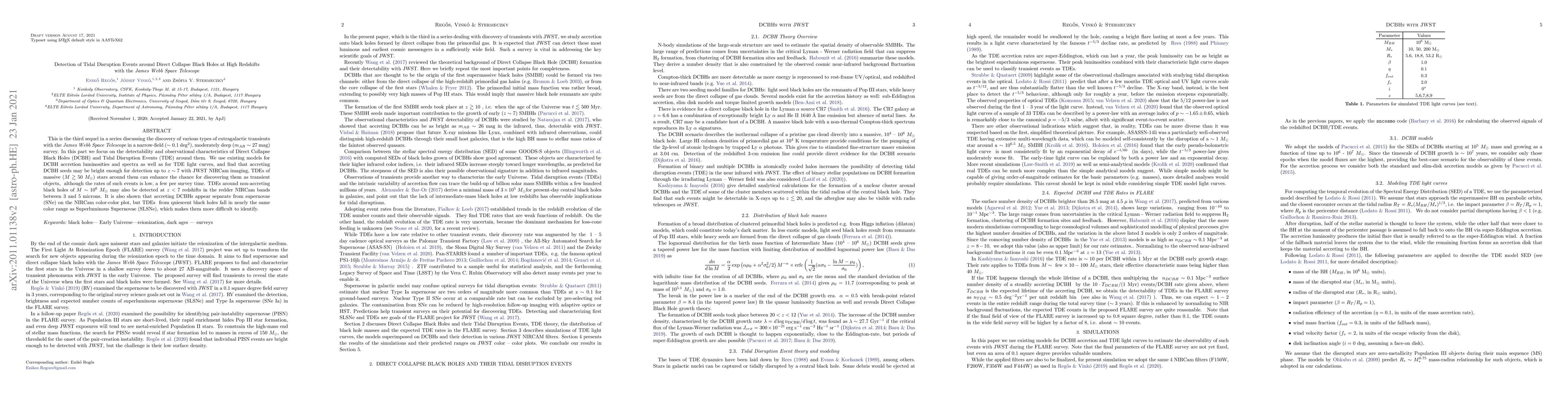 This is the third sequel in a series discussing the discovery of various types of extragalactic transients with the {\it James Webb Space Telescope} in a narrow-field ($\sim 0.1$ deg$^2$), moderately deep ($m_{AB} \sim 27$ mag) survey. In this part we focus on the detectability and observational characteristics of Direct Collapse Black Holes (DCBH) and Tidal Disruption Events (TDE) around them. We use existing models for DCBH accretion luminosities and spectra as well as for TDE light curves, and find that accreting DCBH seeds may be bright enough for detection up to $z \sim 7$ with JWST NIRCam imaging, TDEs of massive ($M \gtrsim 50$ Msol) stars around them can enhance the chance for discovering them as transient objects, although the rates of such events is low, a few per survey time. TDEs around non-accreting black holes of $M \sim 10^6$ Msol may also be detected at $z < 7$ redshifts in the redder NIRCam bands between 3 and 5 microns. It is also shown that accreting DCBHs appear separate from supernovae (SNe) on the NIRCam color-color plot, but TDEs from quiescent black holes fall in nearly the same color range as Superluminous Supernovae (SLSNe), which makes them more difficult to identify.