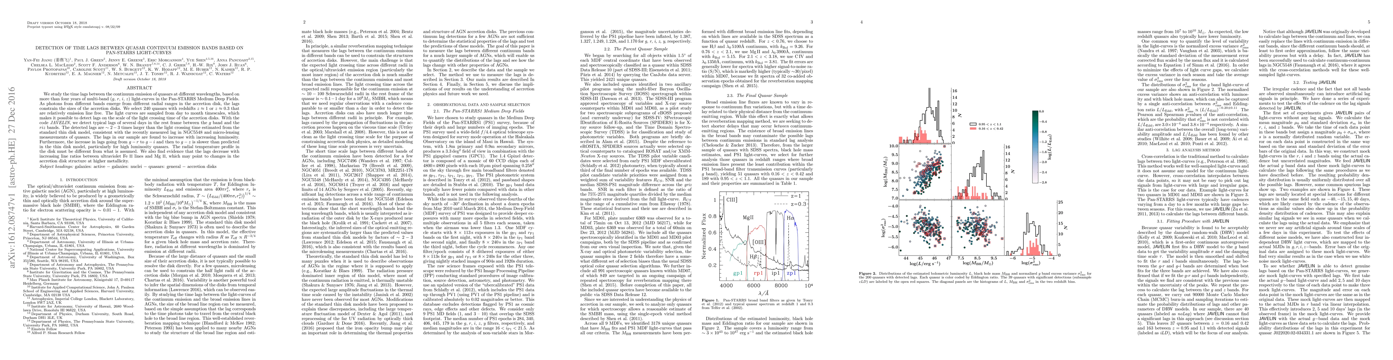 This study detects time lags between different continuum emission bands of quasars using Pan-STARRS light-curves, revealing that lags are larger than predicted by the standard thin disk model. The findings suggest a different radial temperature profile and potential structural changes in the accretion disk at higher metallicity.