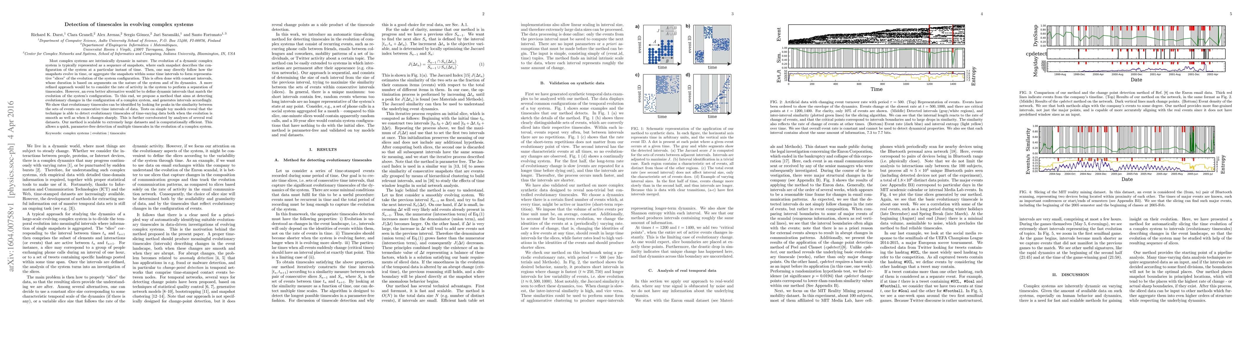 Most complex systems are intrinsically dynamic in nature. The evolution of a dynamic complex system is typically represented as a sequence of snapshots, where each snapshot describes the configuration of the system at a particular instant of time. Then, one may directly follow how the snapshots evolve in time, or aggregate the snapshots within some time intervals to form representative "slices" of the evolution of the system configuration. This is often done with constant intervals, whose duration is based on arguments on the nature of the system and of its dynamics. A more refined approach would be to consider the rate of activity in the system to perform a separation of timescales. However, an even better alternative would be to define dynamic intervals that match the evolution of the system's configuration. To this end, we propose a method that aims at detecting evolutionary changes in the configuration of a complex system, and generates intervals accordingly. We show that evolutionary timescales can be identified by looking for peaks in the similarity between the sets of events on consecutive time intervals of data. Tests on simple toy models reveal that the technique is able to detect evolutionary timescales of time-varying data both when the evolution is smooth as well as when it changes sharply. This is further corroborated by analyses of several real datasets. Our method is scalable to extremely large datasets and is computationally efficient. This allows a quick, parameter-free detection of multiple timescales in the evolution of a complex system.