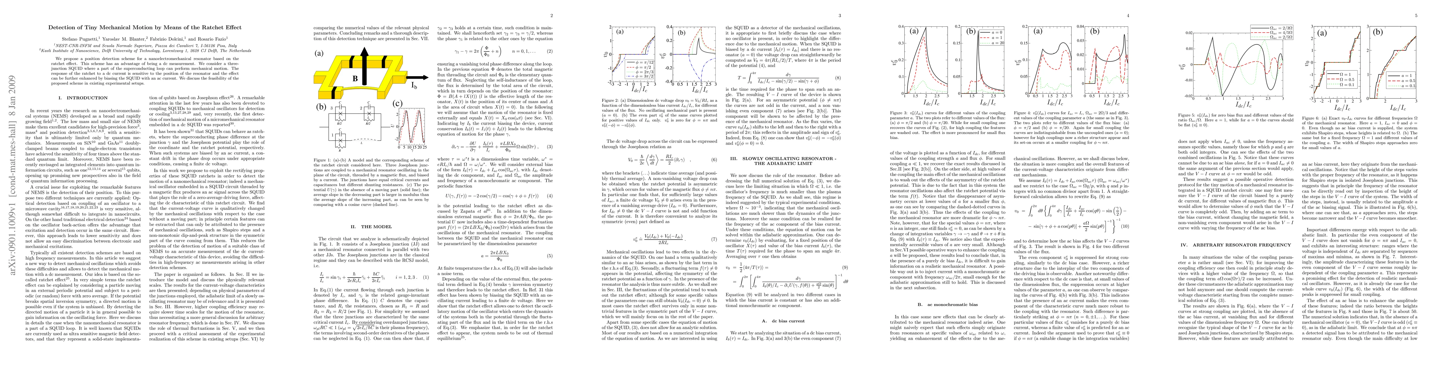 This paper proposes a dc detection method for tiny mechanical motion in a nanoelectromechanical resonator using the ratchet effect in a three-junction SQUID, enhanced by ac current biasing, and assesses its feasibility in current experimental setups.