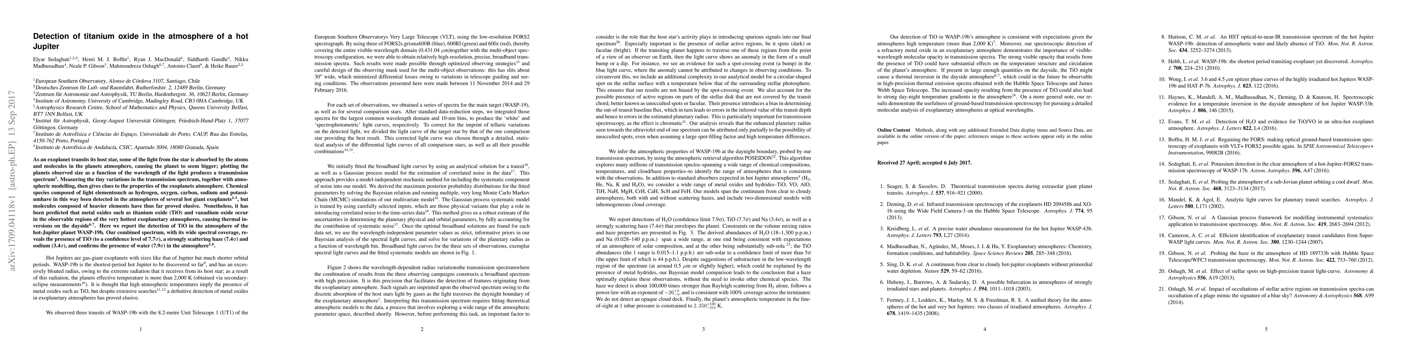 This study reports the first detection of titanium oxide (TiO) in the atmosphere of the hot Jupiter WASP-19b using a wide spectral coverage transmission spectrum, alongside confirming the presence of water, sodium, and a scattering haze. The findings provide new insights into the atmospheric composition of the hottest exoplanetary atmospheres.