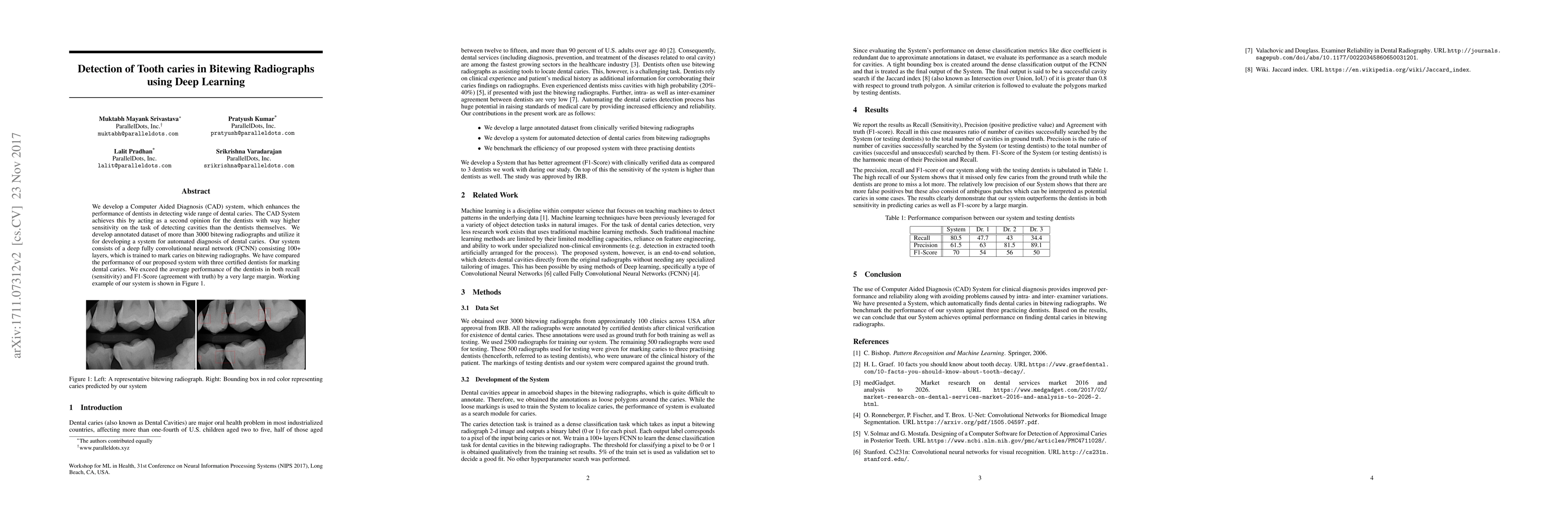This paper presents a deep learning-based CAD system for detecting tooth caries in bitewing radiographs, outperforming certified dentists in sensitivity and accuracy. The system uses a deep fully convolutional neural network trained on an annotated dataset of over 3000 radiographs.