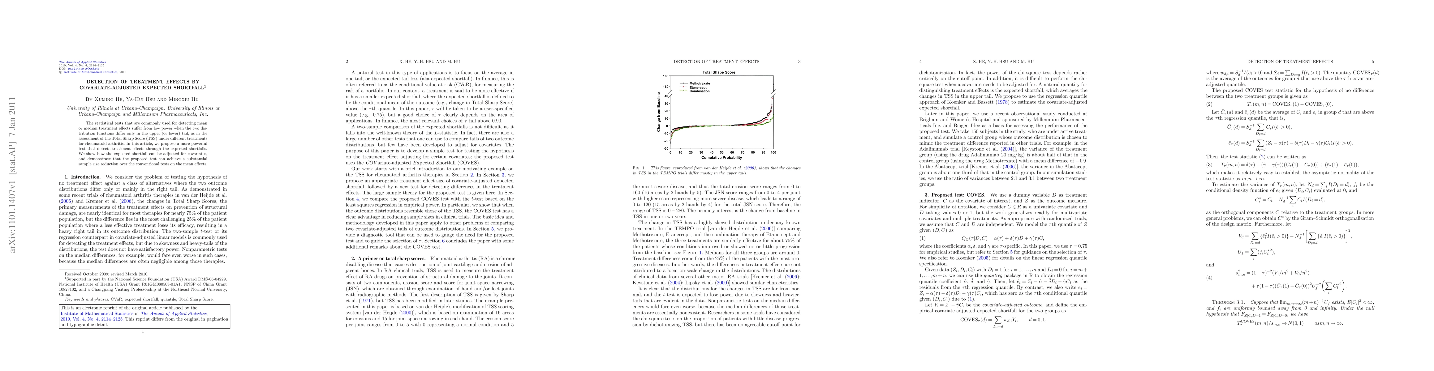 This paper proposes a new test to detect treatment effects by using covariate-adjusted expected shortfalls, which offers higher power than conventional tests when distribution functions differ mainly in their tails, as demonstrated in the context of rheumatoid arthritis treatment assessments. The method achieves significant sample size reductions compared to traditional mean-based tests.