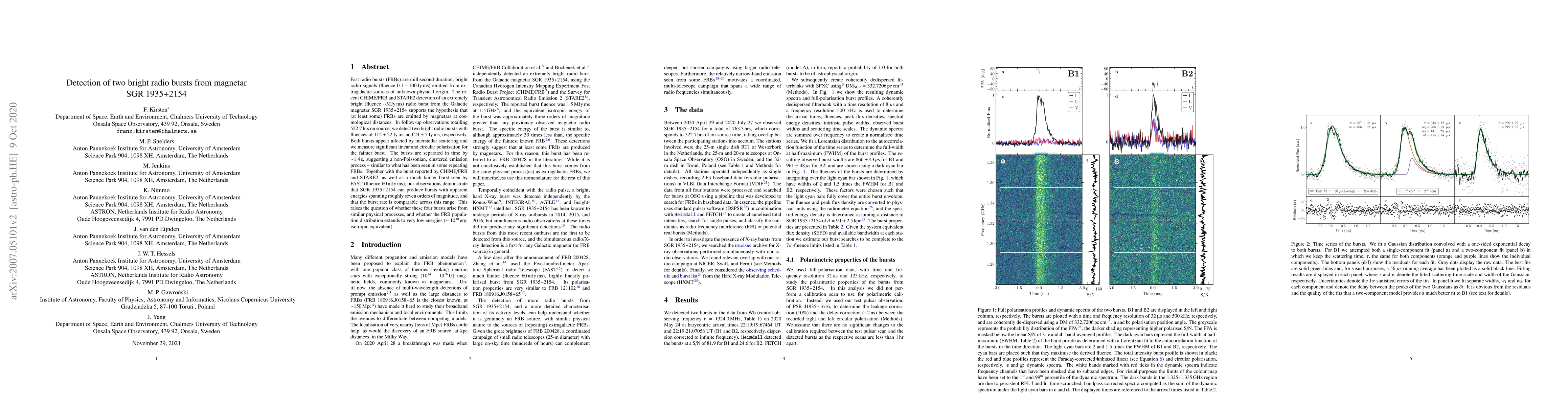 This paper reports the detection of two bright radio bursts from the magnetar SGR 1935+2154, supporting the theory that some fast radio bursts originate from magnetars. The bursts exhibit significant scattering and polarization, suggesting a clustered emission process similar to repeating FRBs.
