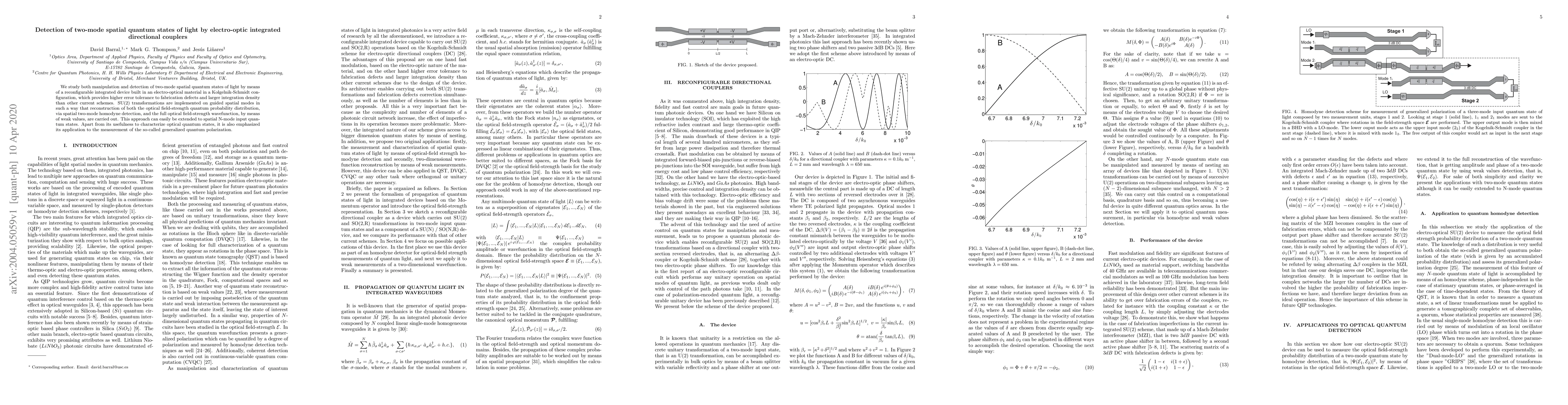 We study both manipulation and detection of two-mode spatial quantum states of light by means of a reconfigurable integrated device built in an electro-optical material in a Kolgelnik-Schmidt configuration, which provides higher error tolerance to fabrication defects and larger integration density than other current schemes. SU(2) transformations are implemented on guided spatial modes in such a way that reconstruction of both the optical field-strength quantum probability distribution, via spatial two-mode homodyne detection, and the full optical field-strength wavefunction, by means of weak values, are carried out. This approach can easily be extended to spatial N-mode input quantum states. Apart from its usefulness to characterize optical quantum states, it is also emphasized its application to the measurement of the so-called generalized quantum polarization.