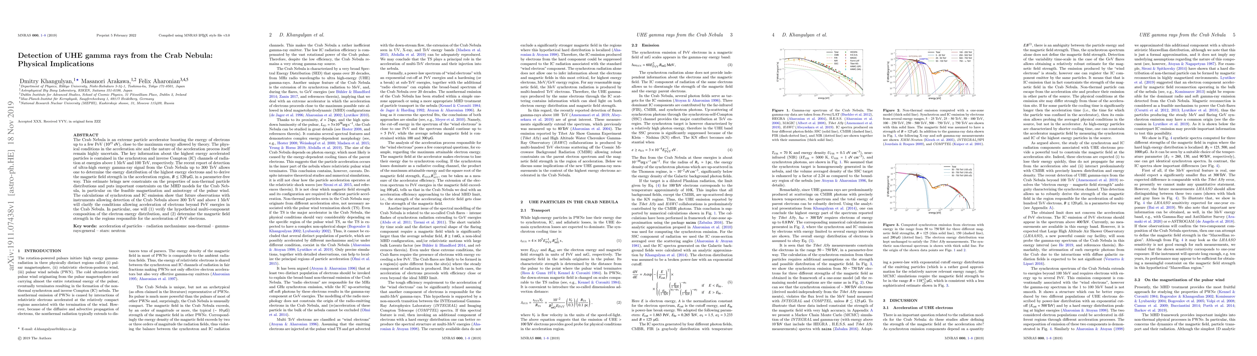 The paper presents a detailed analysis of UHE gamma-ray emission from the Crab Nebula, providing a method to estimate magnetic field strengths and particle distributions using synchrotron and IC emission calculations.