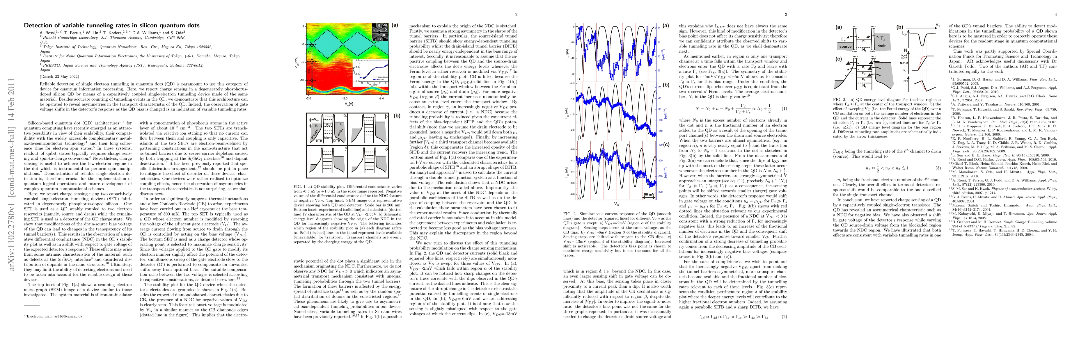 This paper reports on the detection of single electron tunneling in silicon quantum dots (QD) using a capacitively coupled tunneling device, revealing variable tunneling rates indicated by gate voltage shifts in the detector's response. The study highlights the potential of this architecture for quantum information processing.