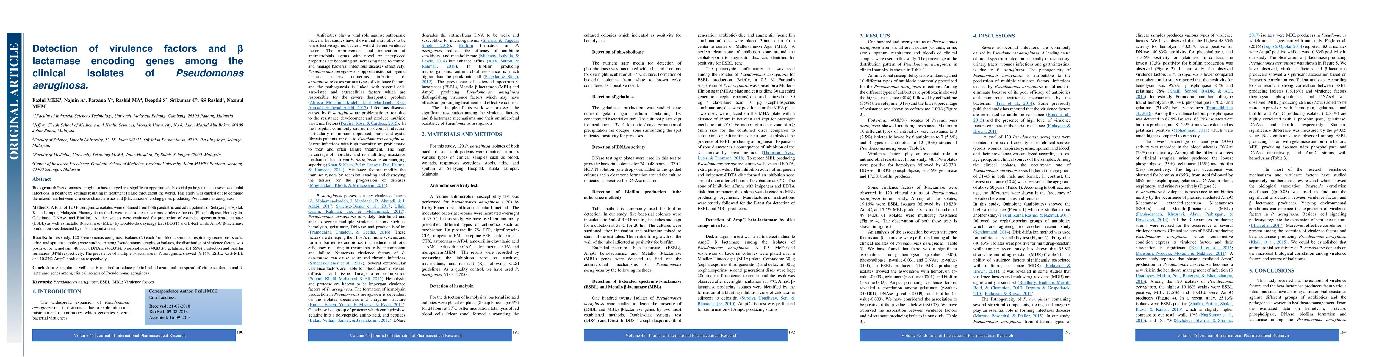 Summary: This study investigates the relationship between virulence factors and beta-lactamase encoding genes in Pseudomonas aeruginosa clinical isolates from Selayang Hospital. The research found significant production of hemolysin, DNAse, phospholipase, gelatinase, and biofilm formation, alongside varying levels of ESBL, MBL, and AmpC beta-lactamase production, highlighting the pathogen's potential for treatment failure.