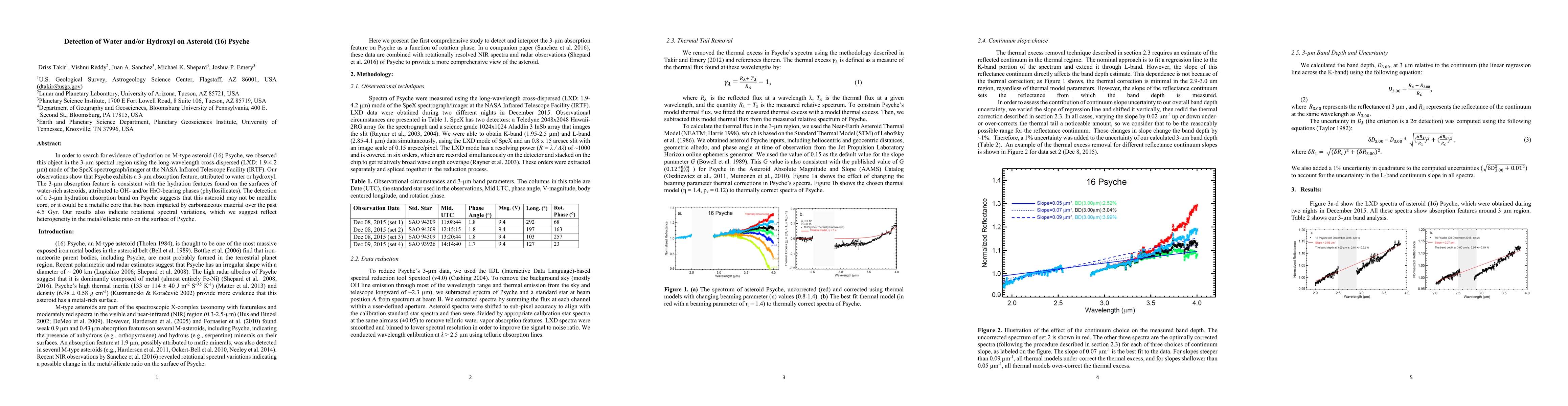 This study detected a 3 micron absorption feature on asteroid (16) Psyche, suggesting the presence of water or hydroxyl, indicating it may not have a metallic core or that its core has been altered by impacts. Spectral variations hint at surface heterogeneity in metal/silicate ratios.