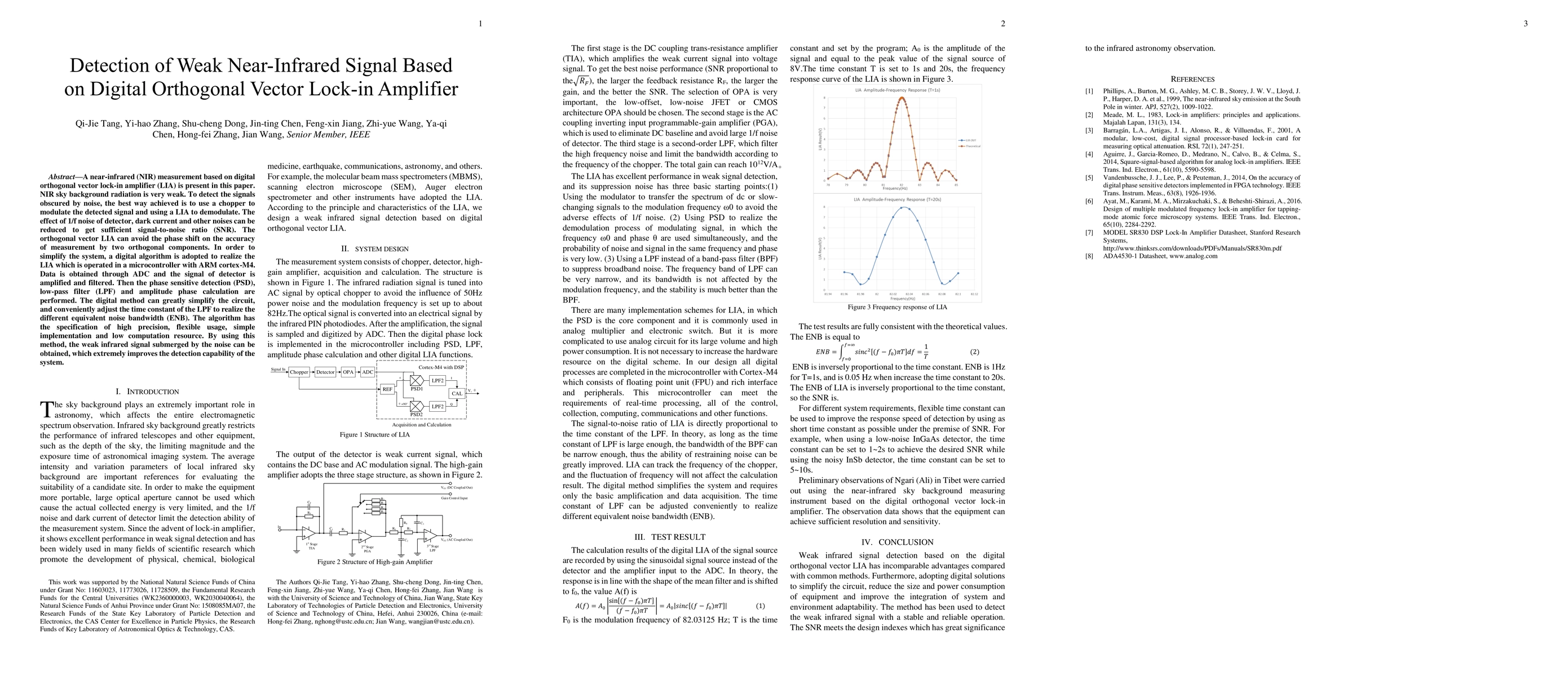 Researchers developed a digital orthogonal vector lock-in amplifier to detect weak near-infrared signals by modulating the signal with a chopper and demodulating it using a low-noise algorithm, resulting in improved detection capability.