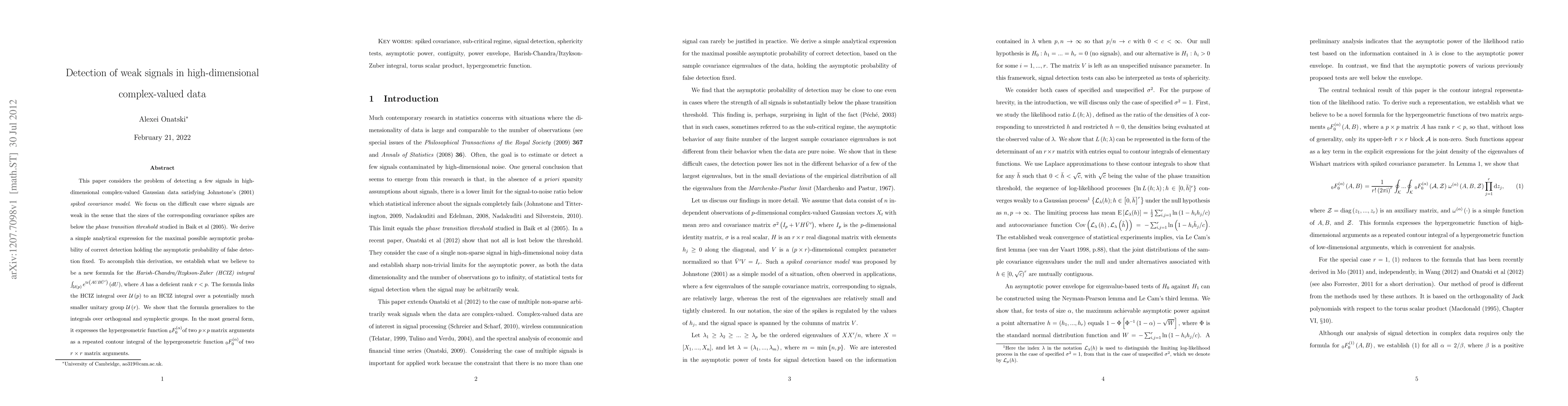 This paper considers the problem of detecting a few signals in high-dimensional complex-valued Gaussian data satisfying Johnstone's (2001) \textit{spiked covariance model}. We focus on the difficult case where signals are weak in the sense that the sizes of the corresponding covariance spikes are below the \textit{phase transition threshold} studied in Baik et al (2005). We derive a simple analytical expression for the maximal possible asymptotic probability of correct detection holding the asymptotic probability of false detection fixed. To accomplish this derivation, we establish what we believe to be a new formula for the \textit{% Harish-Chandra/Itzykson-Zuber (HCIZ) integral} $\int_{\mathcal{U}(p)}e^{\tr(AGBG^{-1})}dG $, where $A$ has a deficient rank $r