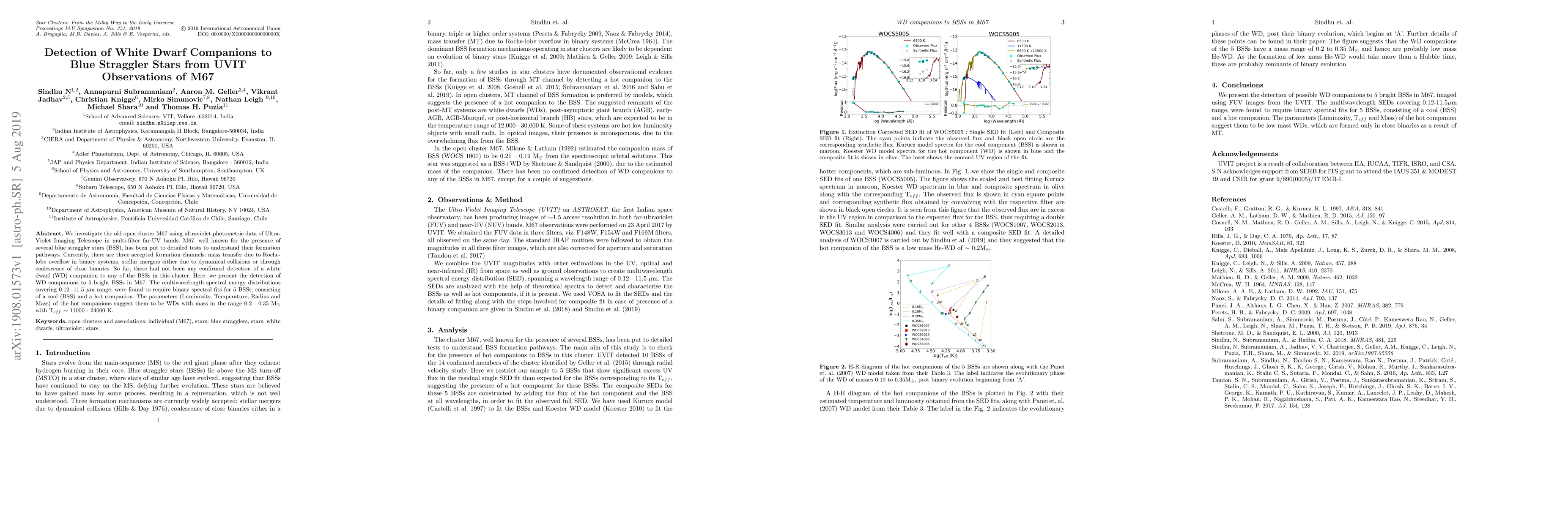 This study uses UVIT observations to detect white dwarf companions to five blue straggler stars in the M67 cluster, providing evidence for mass transfer as a formation pathway for these stars. The detected white dwarfs have masses between 0.2 - 0.35 M$_{\odot}$ and effective temperatures around 11000 - 24000 K.