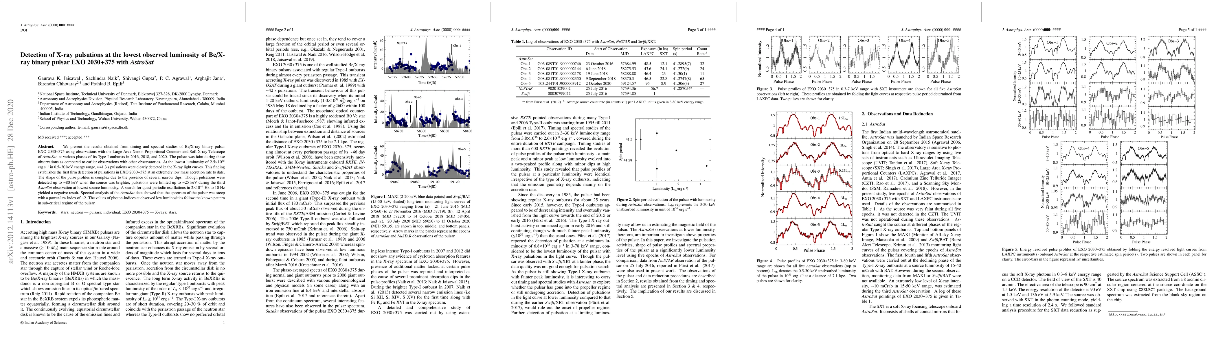This study detected X-ray pulsations in the Be/X-ray binary pulsar EXO 2030+375 at its lowest observed luminosity of 2.5×10^35 erg s^-1 using AstroSat's instruments. The pulsar exhibited complex pulse profiles and steep spectral characteristics, marking the first firm detection of pulsations at such low mass accretion rates.