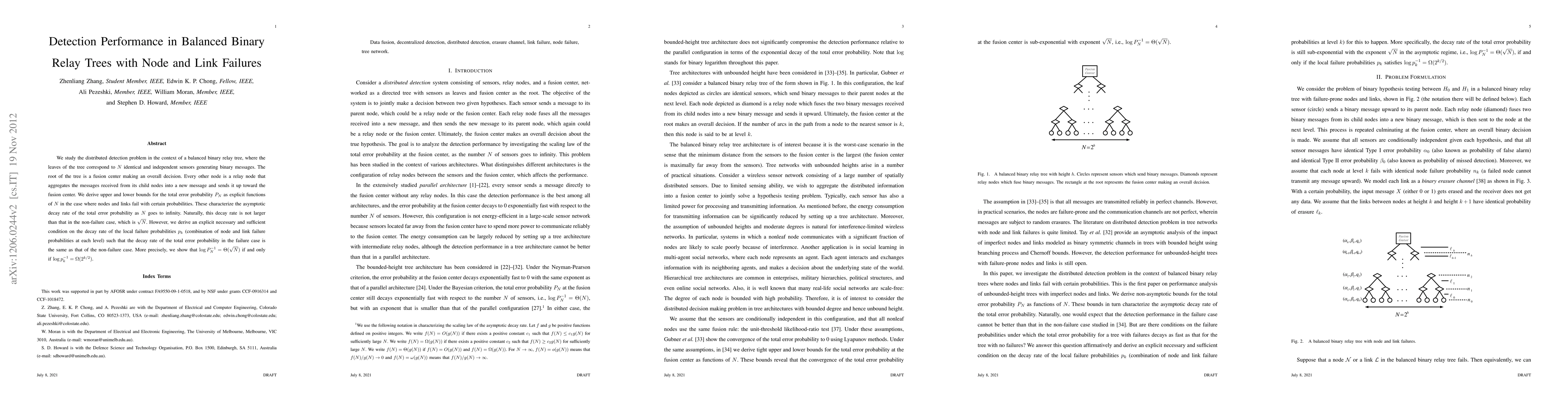 This research paper analyzes error probability in distributed detection systems using balanced binary relay trees, accounting for node and link failures. It derives bounds for total error probability as functions of the number of sensors (N) and failure probabilities, identifying conditions under which error decay rate matches the non-failure case, i.e., sqrt{N}.