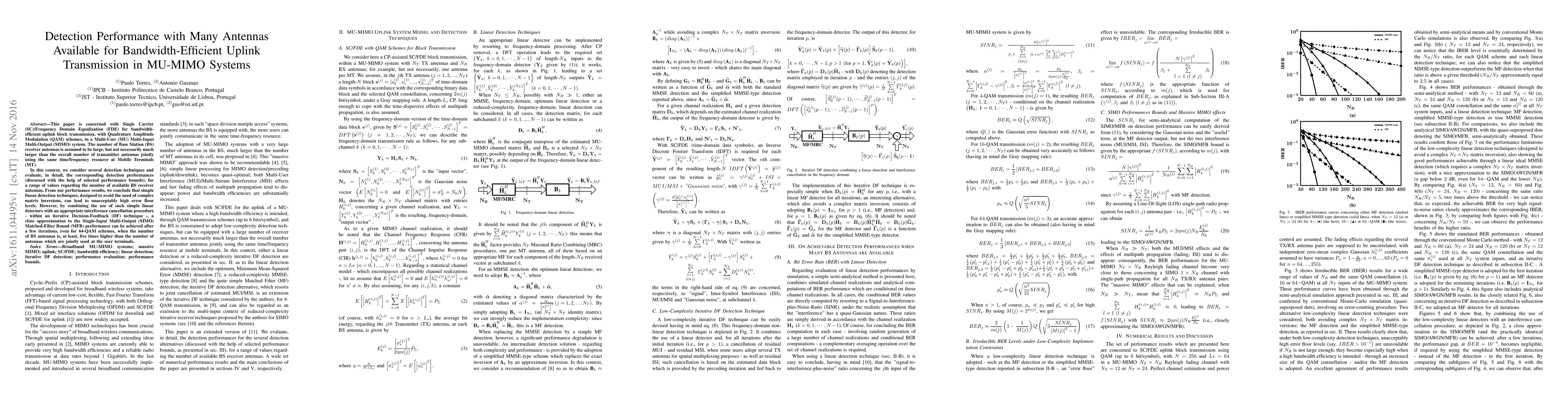 This paper evaluates detection performance in MU-MIMO systems using SC/FDE and QAM schemes, finding that simple linear detectors lead to high error rates but combining them with iterative DF and interference cancellation can approximate SIMO MFB performance when the base station has significantly more antennas than user terminals.