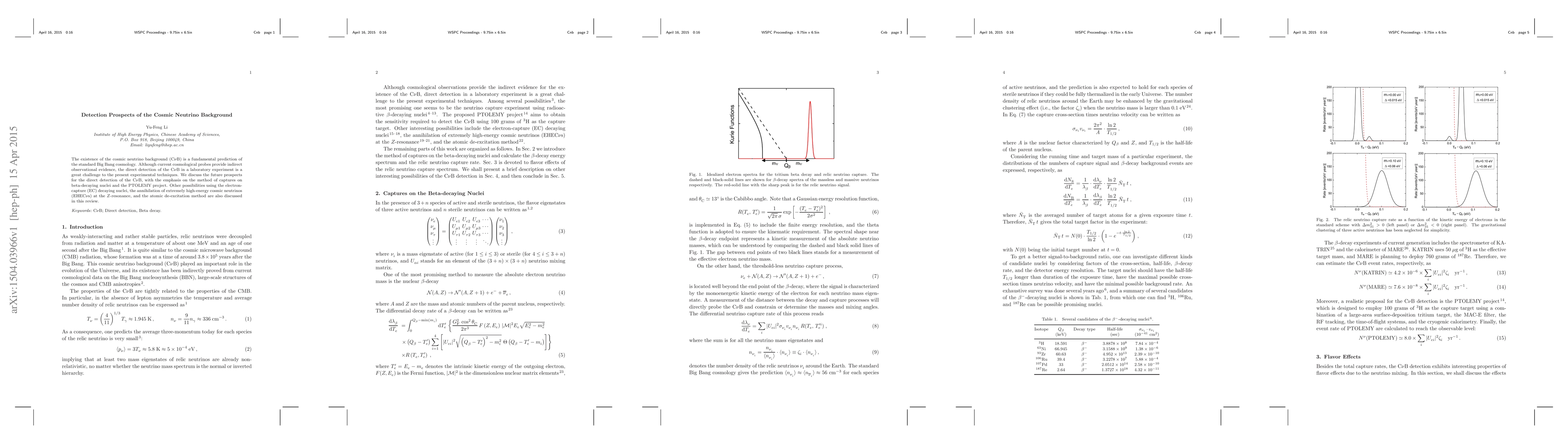This paper reviews the prospects for detecting the cosmic neutrino background (CnuB), a prediction of the Big Bang theory, focusing on methods like capturing neutrinos on beta-decaying nuclei, particularly through the PTOLEMY project, and exploring other techniques such as electron-capture decay, Z-resonance annihilation, and atomic de-excitation. Direct detection remains a significant experimental challenge.