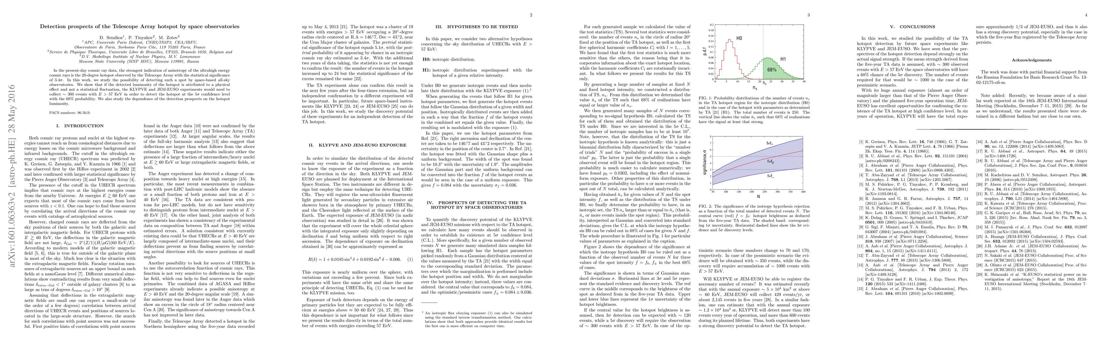 In the present-day cosmic ray data, the strongest indication of anisotropy of the ultrahigh energy cosmic rays is the 20-degree hotspot observed by the Telescope Array with the statistical significance of 3.4\sigma. In this work, we study the possibility of detecting such a spot by space-based all-sky observatories. We show that if the detected luminosity of the hotspot is attributed to a physical effect and not a statistical fluctuation, the KLYPVE and JEM-EUSO experiments would need to collect ~300 events with E>57 EeV in order to detect the hotspot at the 5\sigma\ confidence level with the 68% probability. We also study the dependence of the detection prospects on the hotspot luminosity.