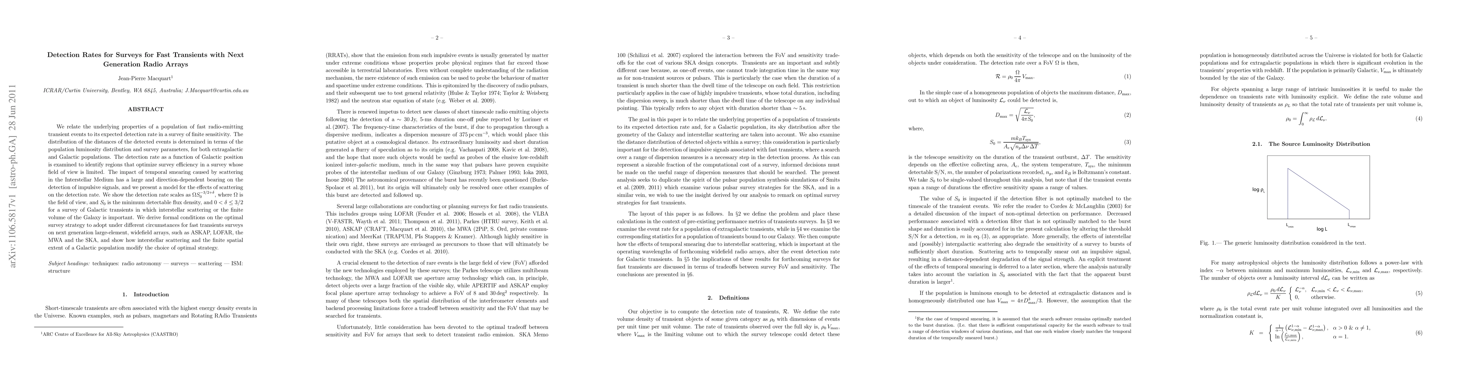 We relate the underlying properties of a population of fast radio-emitting transient events to its expected detection rate in a survey of finite sensitivity. The distribution of the distances of the detected events is determined in terms of the population luminosity distribution and survey parameters, for both extragalactic and Galactic populations. The detection rate as a function of Galactic position is examined to identify regions that optimize survey efficiency in a survey whose field of view is limited. The impact of temporal smearing caused by scattering in the Interstellar Medium has a large and direction-dependent bearing on the detection of impulsive signals, and we present a model for the effects of scattering on the detection rate. We show the detection rate scales as Omega S0^{-3/2 + delta}, where Omega is the field of view, and S0 is the minimum detectable flux density, and 0 < delta =< 3/2 for a survey of Galactic transients in which interstellar scattering or the finite volume of the Galaxy is important. We derive formal conditions on the optimal survey strategy to adopt under different circumstances for fast transients surveys on next generation large-element, widefield arrays, such as ASKAP, LOFAR, the MWA and the SKA, and show how interstellar scattering and the finite spatial extent of a Galactic population modify the choice of optimal strategy.
