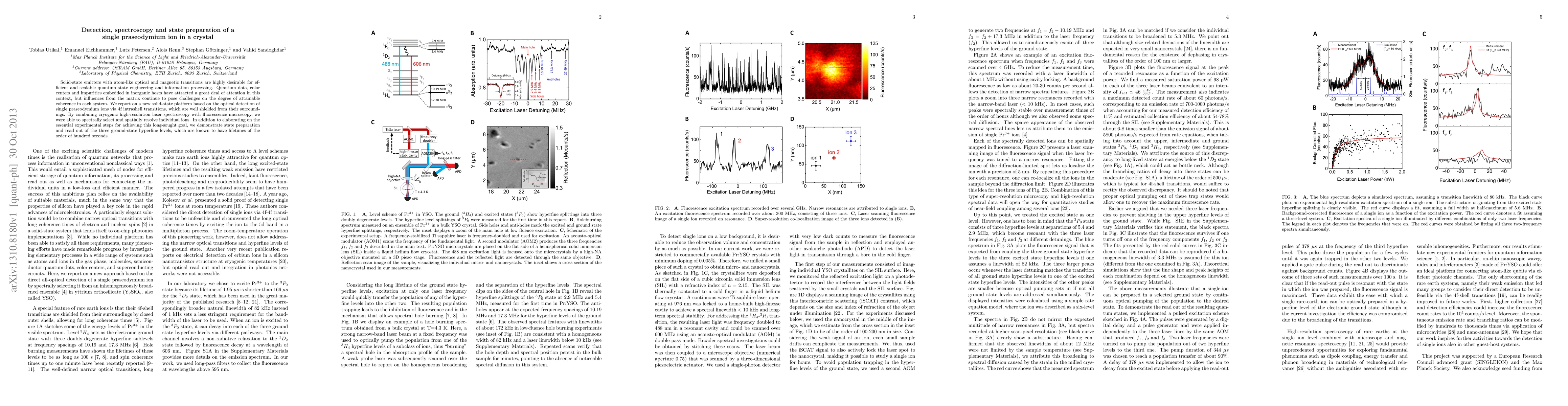 Solid-state emitters with atom-like optical and magnetic transitions are highly desirable for efficient and scalable quantum state engineering and information processing. Quantum dots, color centers and impurities embedded in inorganic hosts have attracted a great deal of attention in this context, but influences from the matrix continue to pose challenges on the degree of attainable coherence in each system. We report on a new solid-state platform based on the optical detection of single praseodymium ions via 4f intrashell transitions, which are well shielded from their surroundings. By combining cryogenic high-resolution laser spectroscopy with fluorescence microscopy, we were able to spectrally select and spatially resolve individual ions. In addition to elaborating on the essential experimental steps for achieving this long-sought goal, we demonstrate state preparation and read out of the three ground-state hyperfine levels, which are known to have lifetimes of the order of hundred seconds.