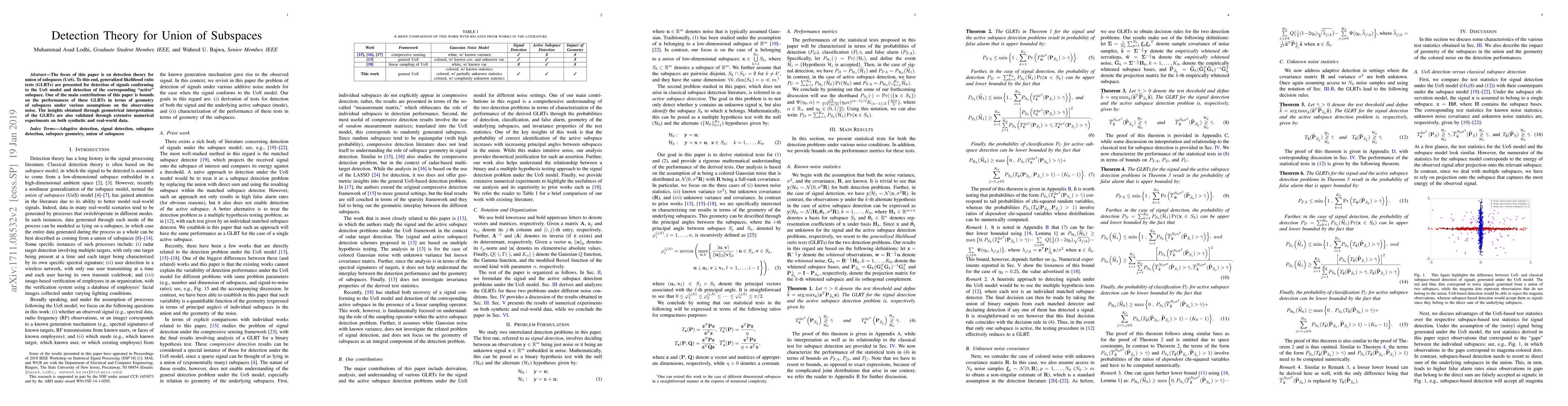 The focus of this paper is on detection theory for union of subspaces (UoS). To this end, generalized likelihood ratio tests (GLRTs) are presented for detection of signals conforming to the UoS model and detection of the corresponding "active" subspace. One of the main contributions of this paper is bounds on the performances of these GLRTs in terms of geometry of subspaces under various assumptions on the observation noise. The insights obtained through geometrical interpretation of the GLRTs are also validated through extensive numerical experiments on both synthetic and real-world data.