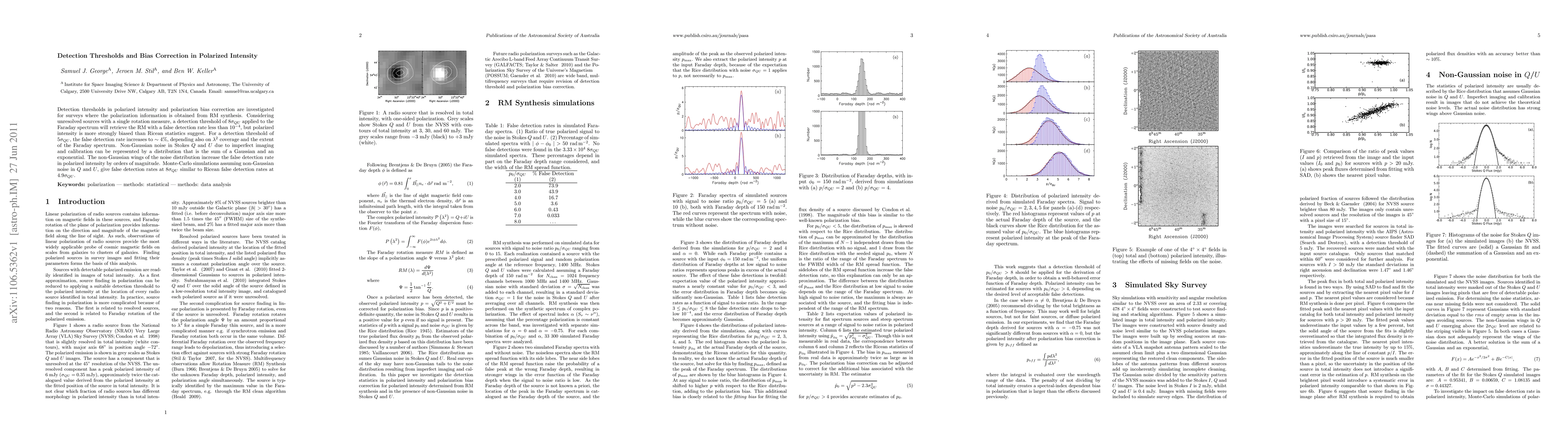 Detection thresholds in polarized intensity and polarization bias correction are investigated for surveys where the polarization information is obtained from RM synthesis. Considering unresolved sources with a single rotation measure, a detection threshold of $8 \sigma_{QU}$ applied to the Faraday spectrum will retrieve the RM with a false detection rate less than $10^{-4}$, but polarized intensity is more strongly biased than Ricean statistics suggest. For a detection threshold of $5 \sigma_{QU}$, the false detection rate increases to ~4%, depending also on $\lambda^2$ coverage and the extent of the Faraday spectrum. Non-Gaussian noise in Stokes Q and U due to imperfect imaging and calibration can be represented by a distribution that is the sum of a Gaussian and an exponential. The non-Gaussian wings of the noise distribution increase the false detection rate in polarized intensity by orders of magnitude. Monte-Carlo simulations assuming non-Gaussian noise in Q and U, give false detection rates at $8 \sigma_{QU}$ similar to Ricean false detection rates at $4.9 \sigma_{QU}$.