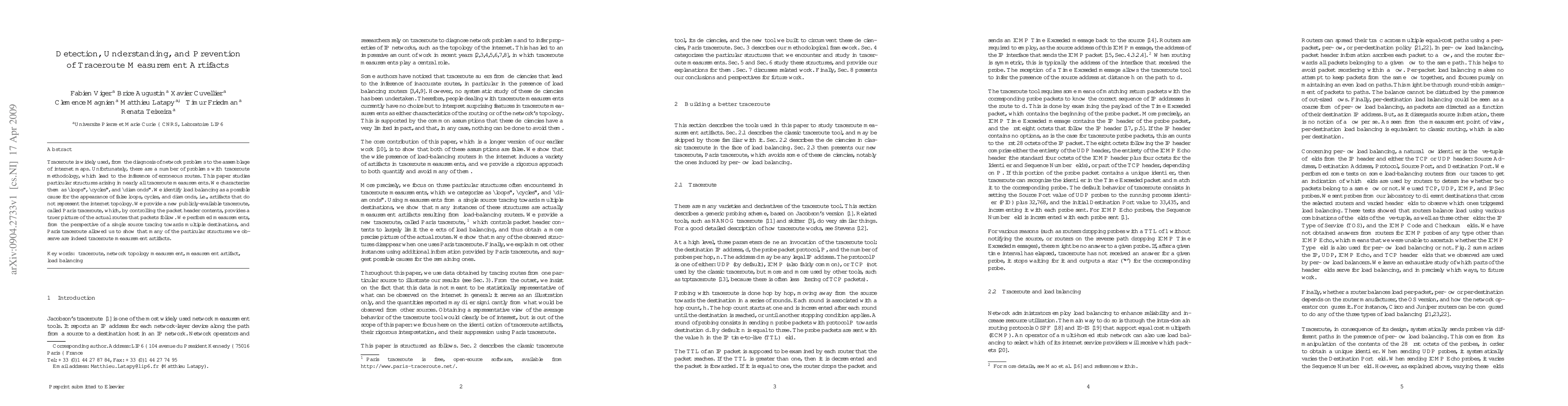 Traceroute is widely used: from the diagnosis of network problems to the assemblage of internet maps. Unfortu- nately, there are a number of problems with traceroute methodology, which lead to the inference of erroneous routes. This paper studies particular structures arising in nearly all traceroute measurements. We characterize them as "loops", "cycles", and "diamonds". We iden- tify load balancing as a possible cause for the appear- ance of false loops, cycles and diamonds, i.e., artifacts that do not represent the internet topology. We pro- vide a new publicly-available traceroute, called Paris traceroute, which, by controlling the packet header con- tents, provides a truer picture of the actual routes that packets follow. We performed measurements, from the perspective of a single source tracing towards multiple destinations, and Paris traceroute allowed us to show that many of the particular structures we observe are indeed traceroute measurement artifacts.