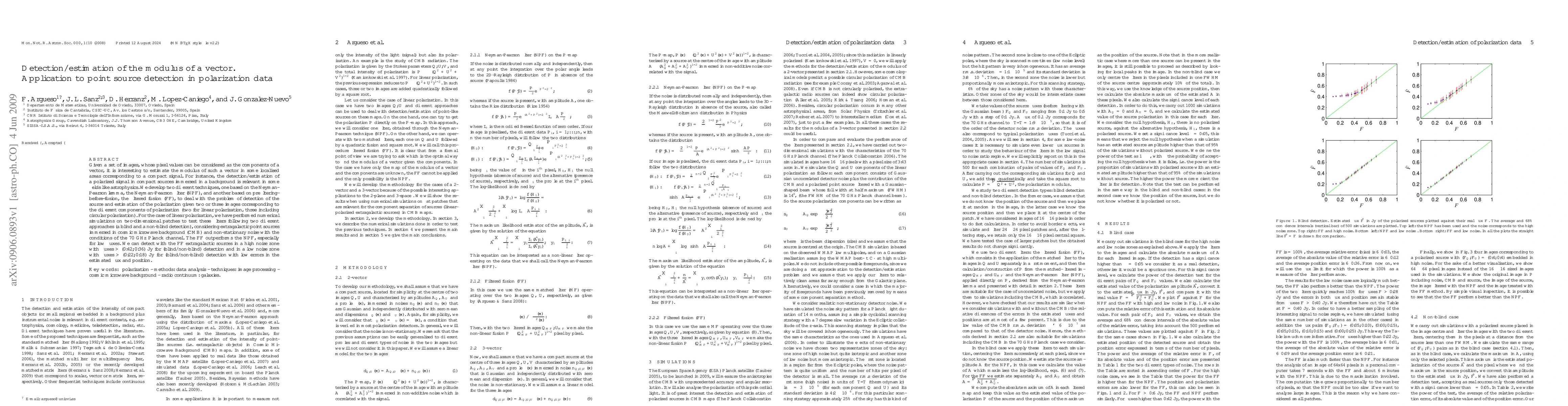 Given a set of images, whose pixel values can be considered as the components of a vector, it is interesting to estimate the modulus of such a vector in some localised areas corresponding to a compact signal. For instance, the detection/estimation of a polarized signal in compact sources immersed in a background is relevant in some fields like astrophysics. We develop two different techniques, one based on the Neyman-Pearson lemma, the Neyman-Pearson filter (NPF), and another based on prefiltering-before-fusion, the filtered fusion (FF), to deal with the problem of detection of the source and estimation of the polarization given two or three images corresponding to the different components of polarization (two for linear polarization, three including circular polarization). For the case of linear polarization, we have performed numerical simulations on two-dimensional patches to test these filters following two different approaches (a blind and a non-blind detection), considering extragalactic point sources immersed in cosmic microwave background (CMB) and non-stationary noise with the conditions of the 70 GHz \emph{Planck} channel. The FF outperforms the NPF, especially for low fluxes. We can detect with the FF extragalactic sources in a high noise zone with fluxes >= (0.42,0.36) Jy for (blind/non-blind) detection and in a low noise zone with fluxes >= (0.22,0.18) Jy for (blind/non-blind) detection with low errors in the estimated flux and position.