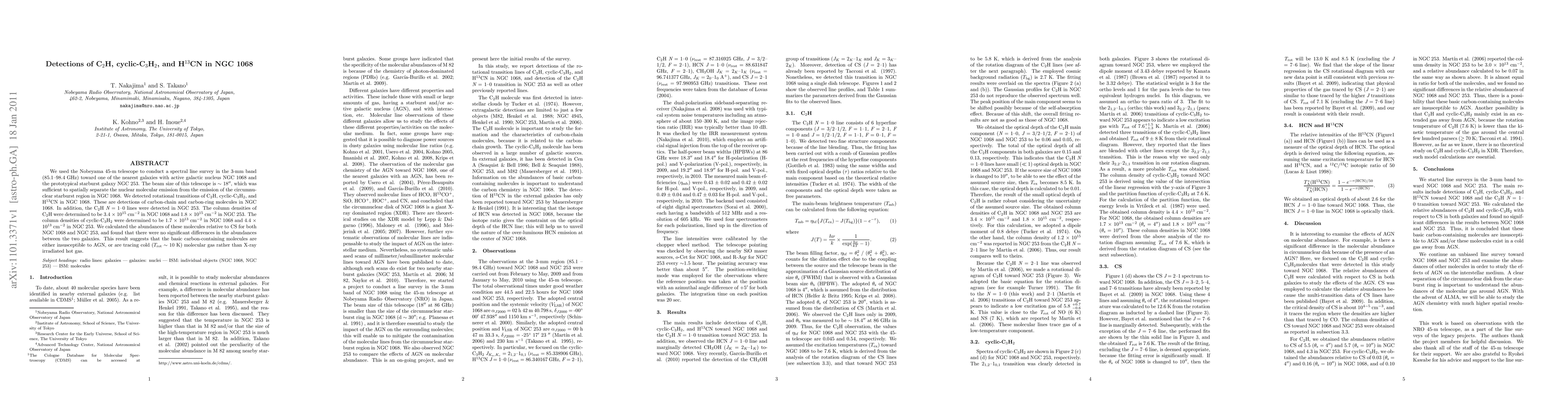 This study detected C2H, cyclic-C3H2, and H13CN in NGC 1068 using the Nobeyama 45-m telescope, revealing carbon-chain and ring molecules. No significant differences in the abundances of these molecules were found between NGC 1068 and NGC 253, suggesting that these molecules trace cold molecular gas rather than hot gas influenced by AGN.