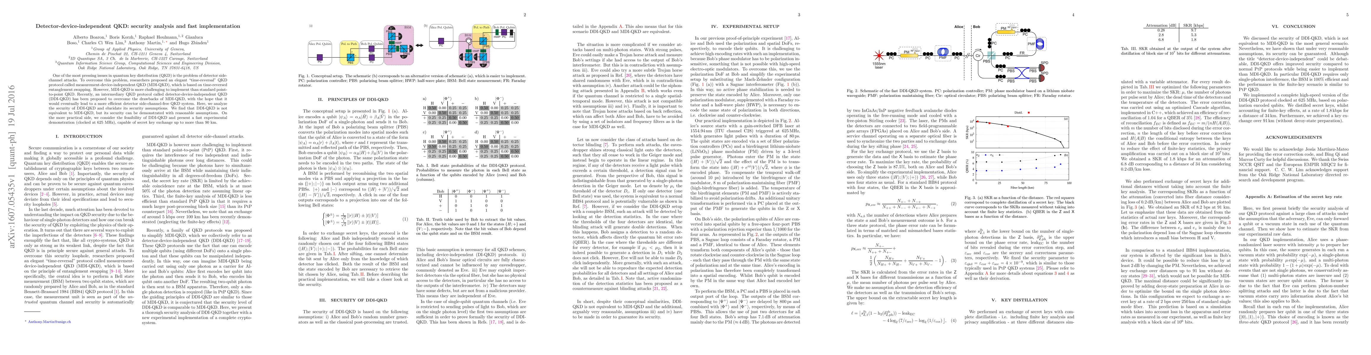 This paper analyzes the security and practical implementation of detector-device-independent QKD (DDI-QKD), demonstrating its security under reasonable assumptions and presenting a fast experimental setup achieving secret key exchange over 90 km.