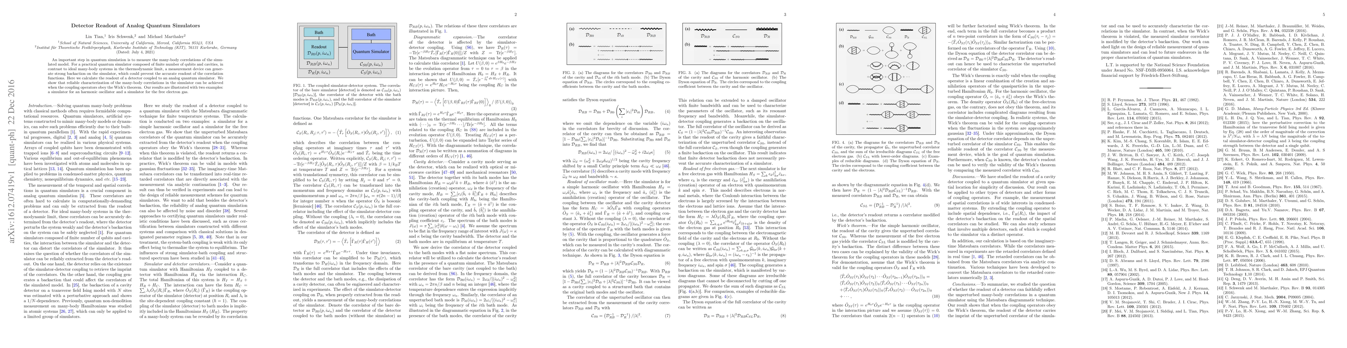 This research calculates the readout of a detector for analog quantum simulators, demonstrating reliable characterization of many-body correlations when coupling operators follow Wick's theorem. The findings are exemplified using harmonic oscillator and free electron gas simulators.