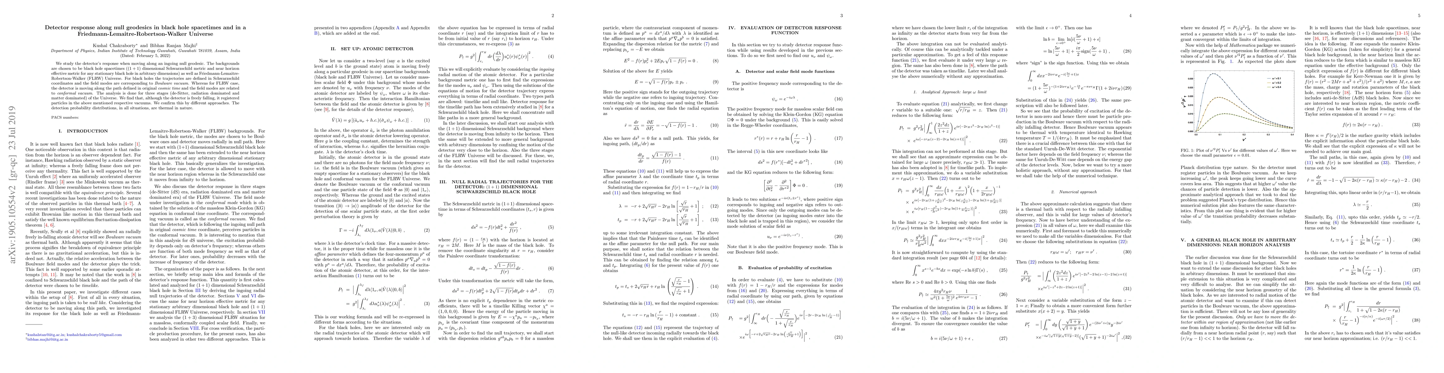 This paper investigates detector responses along ingoing null geodesics in black hole spacetimes and the FLRW Universe, finding thermal detection probabilities in both scenarios despite the detectors' free-fall motion. The study covers black hole metrics and three stages of the FLRW Universe, confirming particle detection in Boulware and conformal vacua.