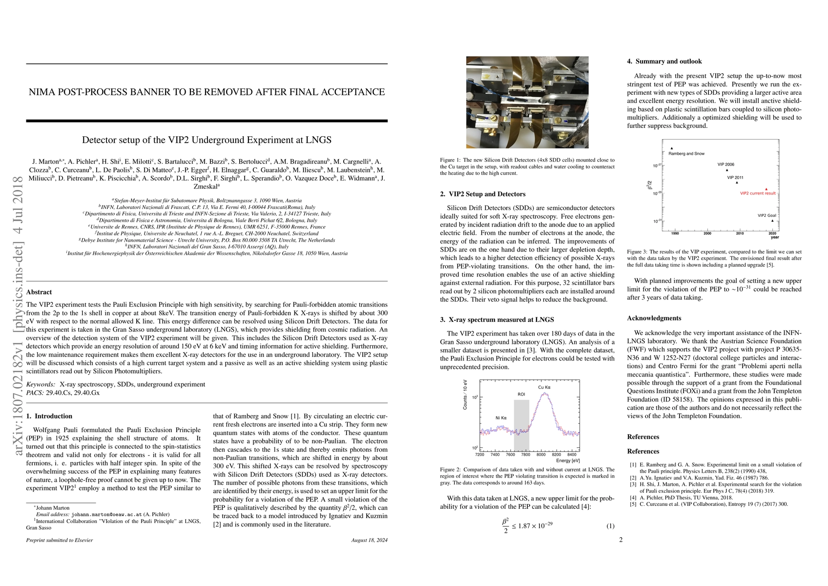 The VIP2 experiment at LNGS investigates Pauli-forbidden atomic transitions in copper using Silicon Drift Detectors for high-resolution X-ray detection, aiming to test the Pauli Exclusion Principle. The setup includes a high current target system and both passive and active shielding to minimize cosmic radiation interference.