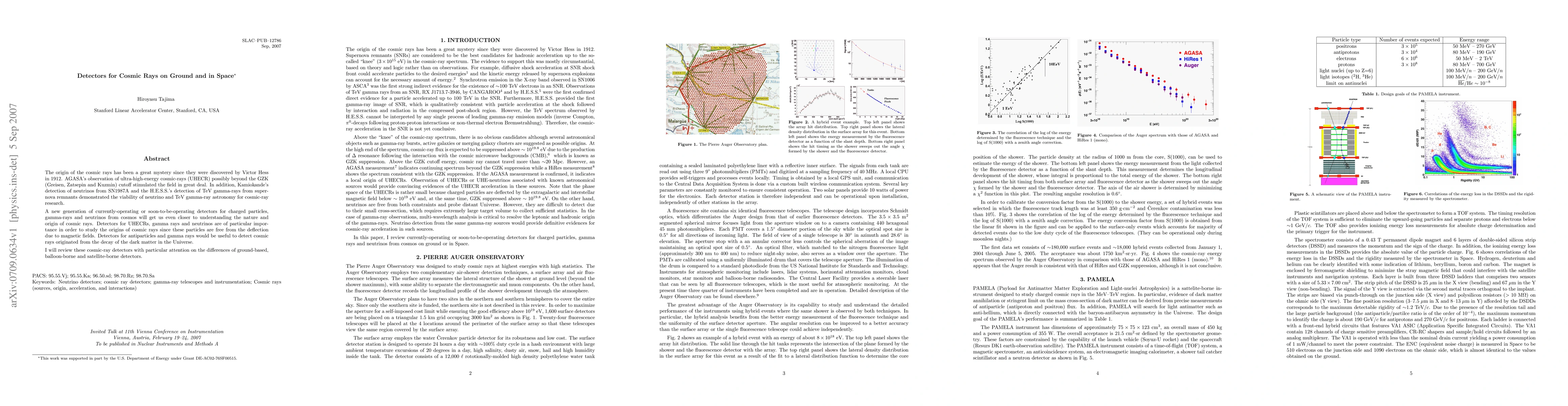 The origin of the cosmic rays has been a great mystery since they were discovered by Victor Hess in 1912. AGASA's observation of ultra-high-energy cosmic-rays (UHECR) possibly beyond the GZK (Greisen, Zatsepin and Kuzmin) cutoff stimulated the field in great deal. In addition, Kamiokande's detection of neutrinos from SN1987A and the H.E.S.S.'s detection of TeV gamma-rays from supernova remnants demonstrated the viability of neutrino and TeV gamma-ray astronomy for cosmic-ray research. A new generation of currently-operating or soon-to-be-operating detectors for charged particles, gamma-rays and neutrinos from cosmos will get us even closer to understanding the nature and origin of cosmic rays. Detectors for UHECRs, gamma rays and neutrinos are of particular importance in order to study the origins of cosmic rays since these particles are free from the deflection due to magnetic fields. Detectors for antiparticles and gamma rays would be useful to detect cosmic rays originated from the decay of the dark matter in the Universe. I will review these cosmic-ray detectors with particular attention on the differences of ground-based, balloon-borne and satellite-borne detectors.