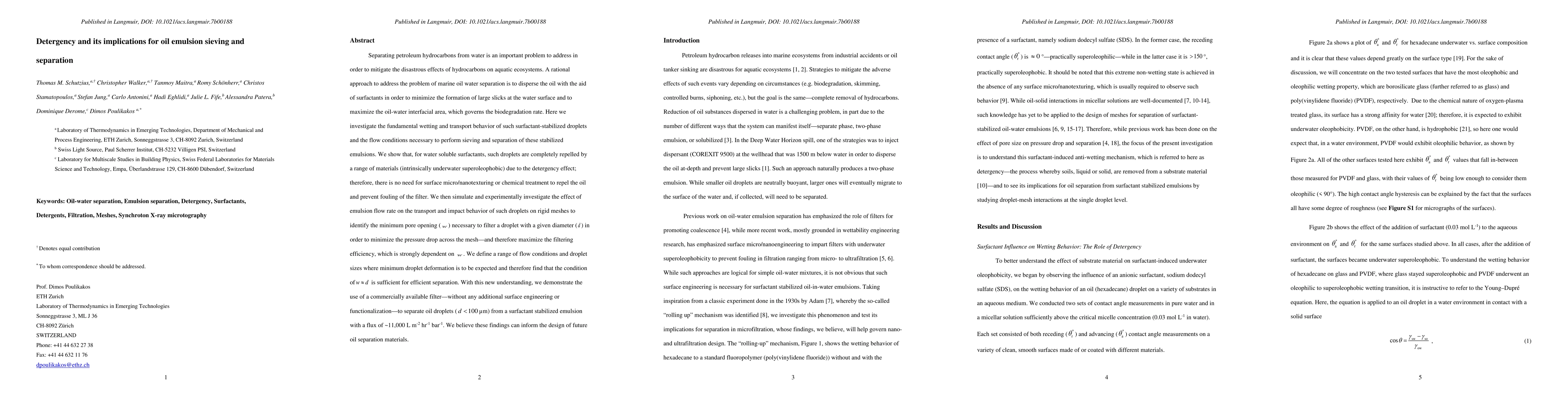 This paper investigates the detergency effect of surfactants in stabilizing oil droplets, enabling efficient separation from water through sieving without surface micro/nanotexturing. The study identifies optimal flow conditions and mesh pore sizes for minimal droplet deformation and maximum filtering efficiency, demonstrating the practical application of a commercially available filter for oil separation.