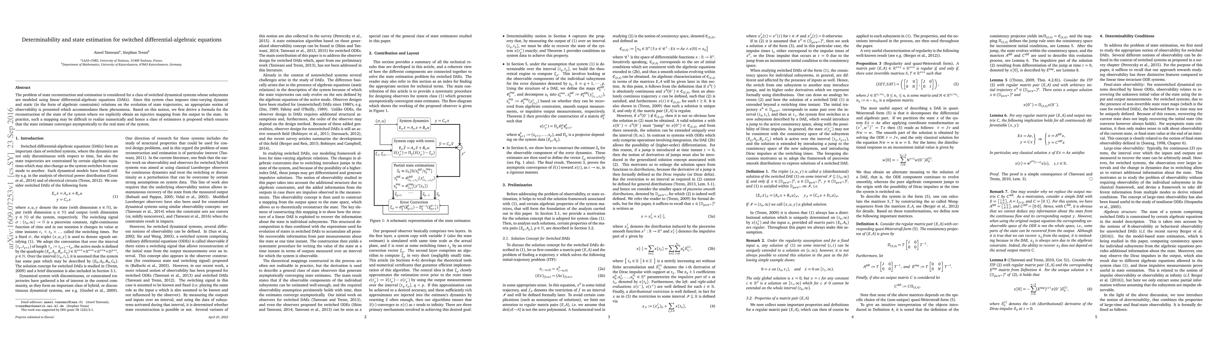 This paper addresses state reconstruction and estimation for switched dynamical systems modeled by linear differential-algebraic equations. It introduces an observability notion accommodating both dynamic and algebraic constraints, and proposes a formula for state reconstruction and a class of estimators ensuring asymptotic convergence to the true state.
