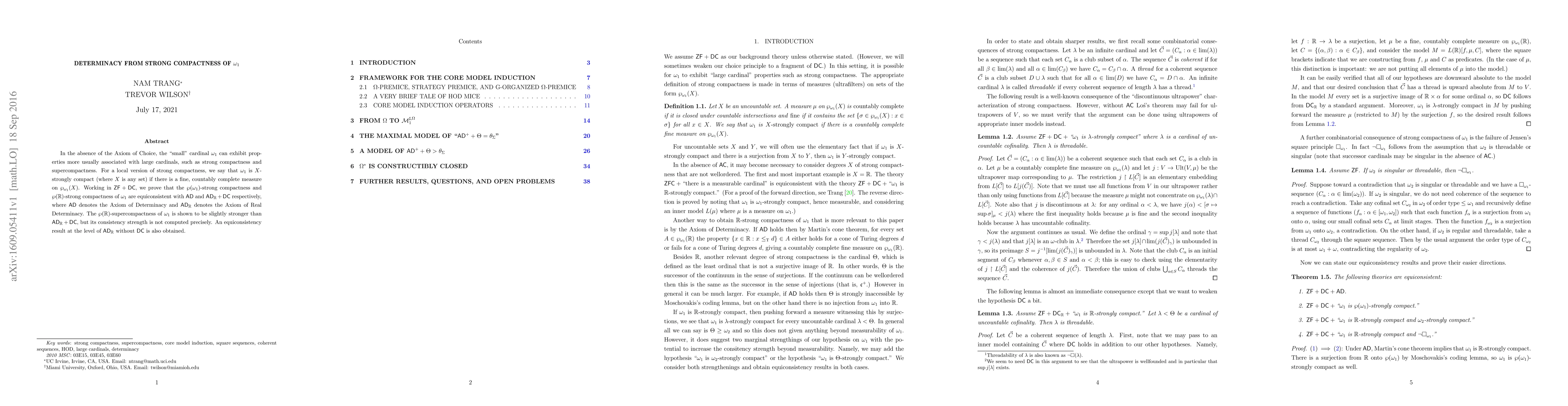 This paper explores the properties of the cardinal $\omega_1$ under strong compactness in the context of Zermelo-Fraenkel set theory without the Axiom of Choice. It establishes equiconsistency results between strong compactness of $\omega_1$ and the Axiom of Determinacy, showing that these properties are equivalent to certain determinacy axioms.