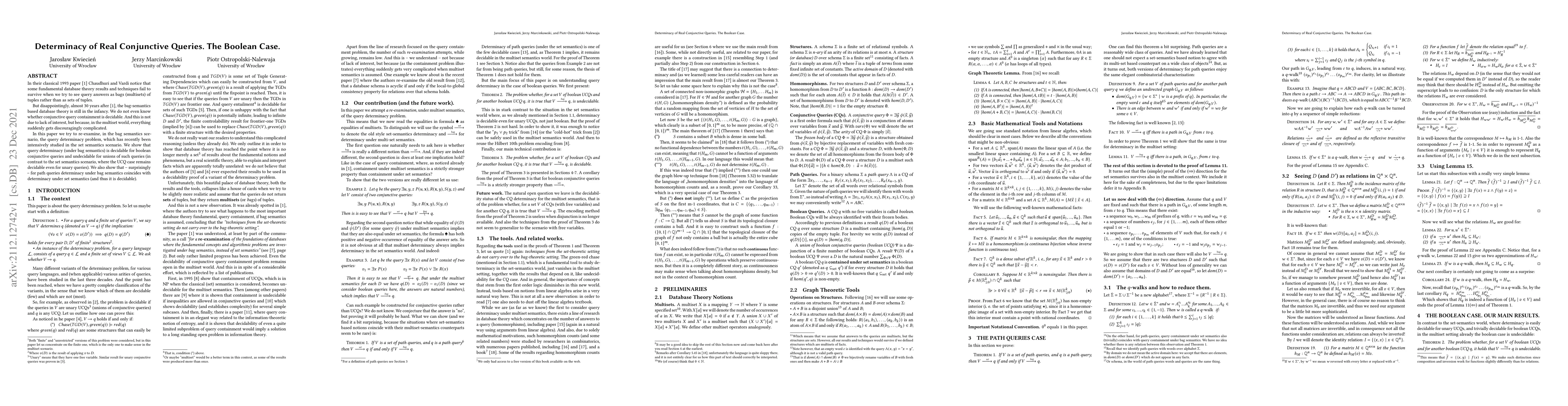 This paper investigates the determinacy of real conjunctive queries under bag semantics, demonstrating that query determinacy is decidable for boolean conjunctive queries but undecidable for their unions. Interestingly, it finds that determinacy for path queries remains decidable under both bag and set semantics.