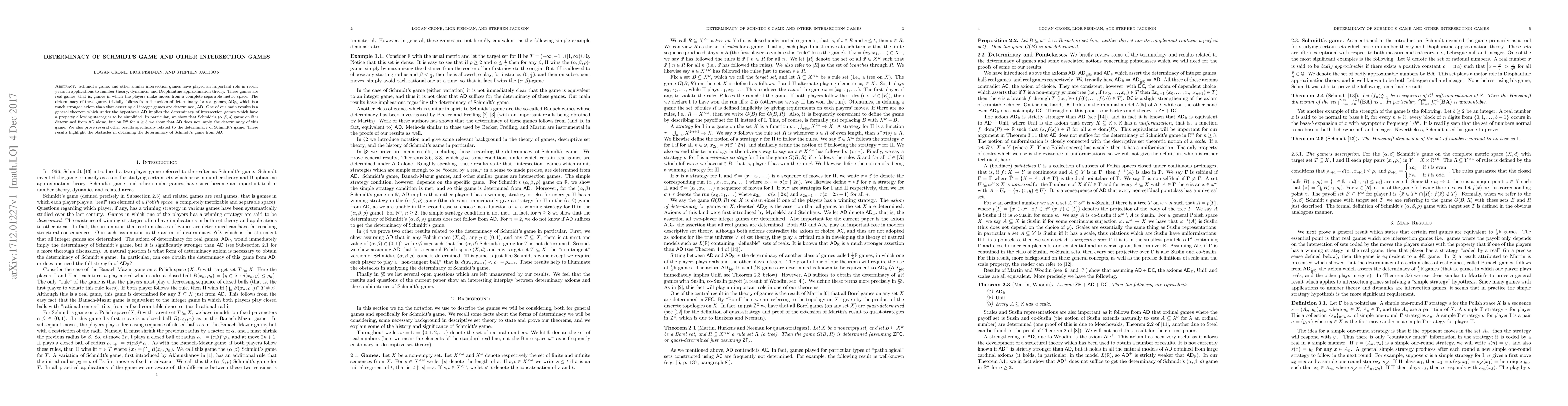 This paper explores the determinacy of Schmidt's game and other intersection games, showing that under $\mathsf{AD}$ the $(\alpha,\beta,\rho)$ game on $\mathbb{R}$ is determined, but $\mathsf{AD}$ does not imply the determinacy of this game on $\mathbb{R}^n$ for $n \geq 3$. The results underscore the complexities in achieving determinacy from $\mathsf{AD}$ alone.