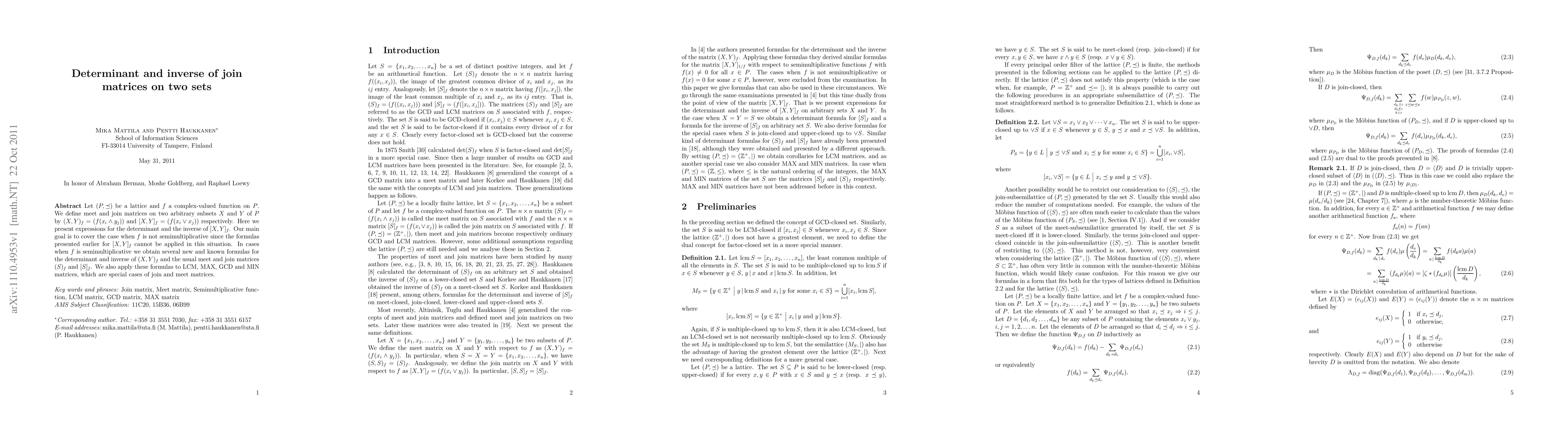 This paper presents expressions for the determinant and inverse of join matrices on two sets within a lattice, addressing cases where the function is not semimultiplicative. It also provides new and known formulas for semimultiplicative functions and applies these to LCM, MAX, GCD, and MIN matrices.