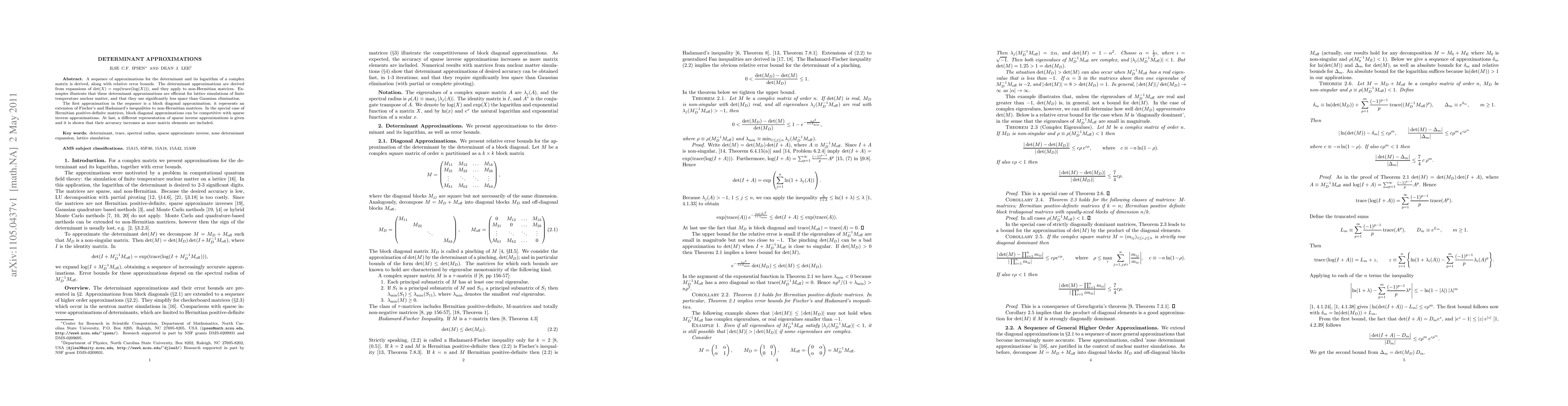This research presents approximations for the determinant and its logarithm of a complex matrix, including error bounds. Derived from det(X)=exp(trace(log(X))), these approximations apply to non-Hermitian matrices and are efficient for lattice simulations in nuclear matter, using less space than Gaussian elimination. The first approximation is a block diagonal extension of Fischer's and Hadamard's inequalities for non-Hermitian matrices. Block diagonal approximations for Hermitian positive-definite matrices can rival sparse inverse approximations. The paper also offers a new representation of sparse inverse approximations, showing improved accuracy with more included matrix elements.