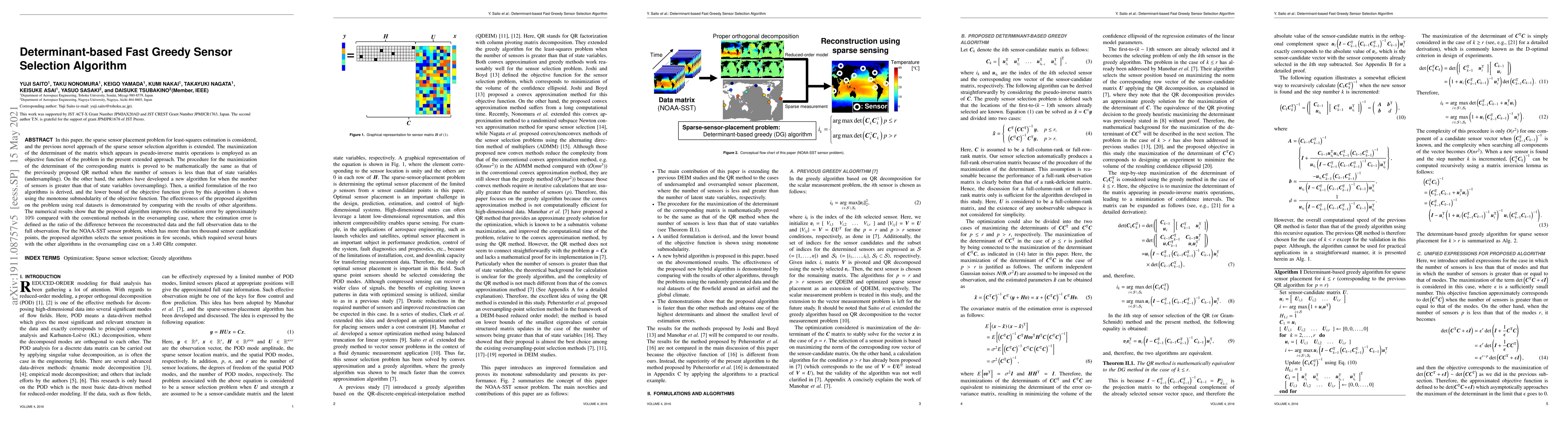 In this paper, the sparse sensor placement problem for least-squares estimation is considered, and the previous novel approach of the sparse sensor selection algorithm is extended. The maximization of the determinant of the matrix which appears in pseudo-inverse matrix operations is employed as an objective function of the problem in the present extended approach. The procedure for the maximization of the determinant of the corresponding matrix is proved to be mathematically the same as that of the previously proposed QR method when the number of sensors is less than that of state variables (undersampling). On the other hand, the authors have developed a new algorithm for when the number of sensors is greater than that of state variables (oversampling). Then, a unified formulation of the two algorithms is derived, and the lower bound of the objective function given by this algorithm is shown using the monotone submodularity of the objective function. The effectiveness of the proposed algorithm on the problem using real datasets is demonstrated by comparing with the results of other algorithms. The numerical results show that the proposed algorithm improves the estimation error by approximately 10% compared with the conventional methods in the oversampling case, where the estimation error is defined as the ratio of the difference between the reconstructed data and the full observation data to the full observation. For the NOAA-SST sensor problem, which has more than ten thousand sensor candidate points, the proposed algorithm selects the sensor positions in few seconds, which required several hours with the other algorithms in the oversampling case on a 3.40 GHz computer.